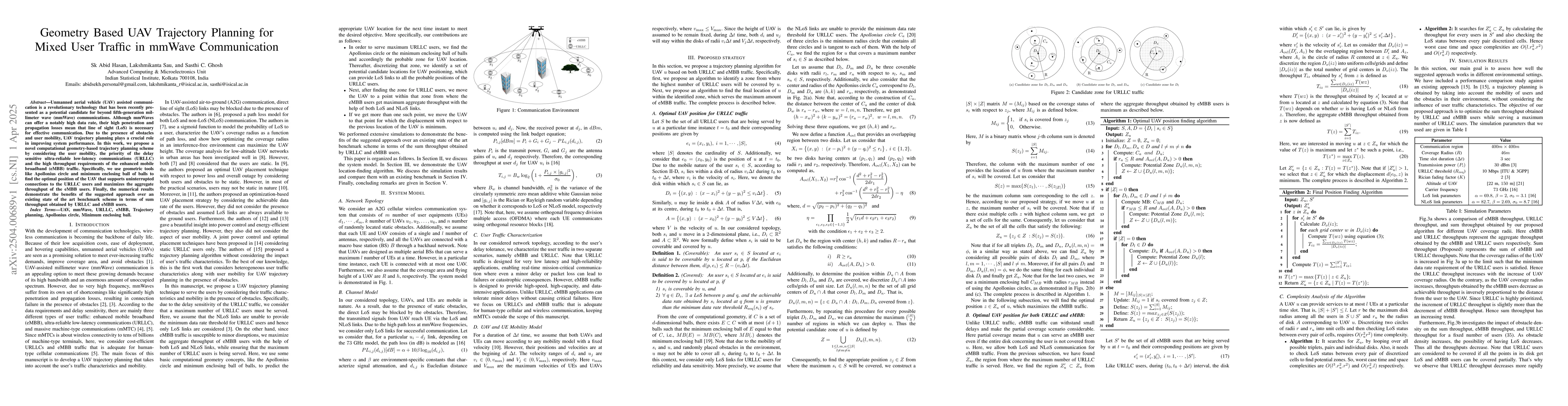 The paper proposes a geometry-based UAV trajectory planning scheme using geometric tools such as Apollonius circle and minimum enclosing ball of balls to optimize UAV position for mixed mmWave traffic (URLLC and eMBB).