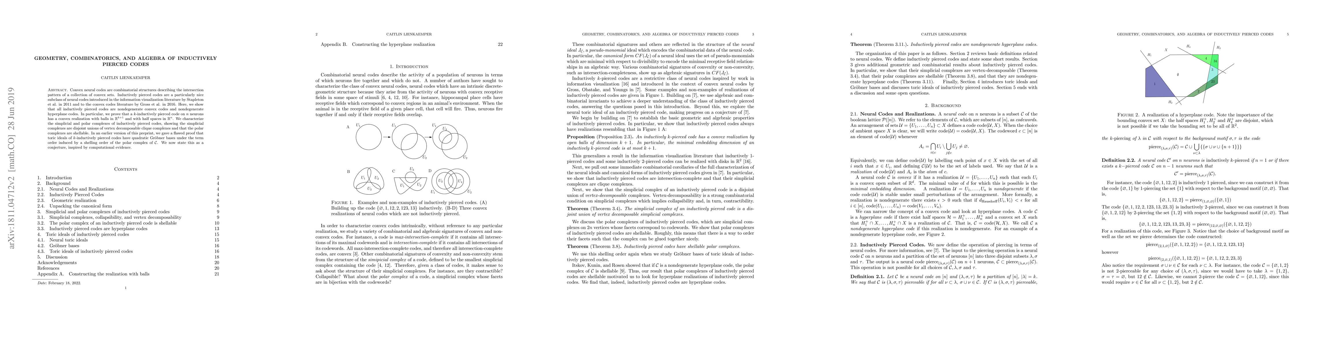 Convex neural codes are combinatorial structures describing the intersection pattern of a collection of convex sets. Inductively pierced codes are a particularly nice subclass of neural codes introduced in the information visualization literature by Stapleton et al. in 2011 and to the convex codes literature by Gross et al. in 2016. Here, we show that all inductively pierced codes are nondegenerate convex codes and nondegenerate hyperplane codes. In particular, we prove that a $k$-inductively pierced code on $n$ neurons has a convex realization with balls in $\mathbb R^{k+1}$ and with half spaces in $\mathbb R^{n}$. We characterize the simplicial and polar complexes of inductively pierced codes, showing the simplicial complexes are disjoint unions of vertex decomposable clique complexes and that the polar complexes are shellable. In an earlier version of this preprint, we gave a flawed proof that toric ideals of $k$-inductively pierced codes have quadratic Gr\"obner bases under the term order induced by a shelling order of the polar complex of $\mathcal C$. We now state this as a conjecture, inspired by computational evidence.