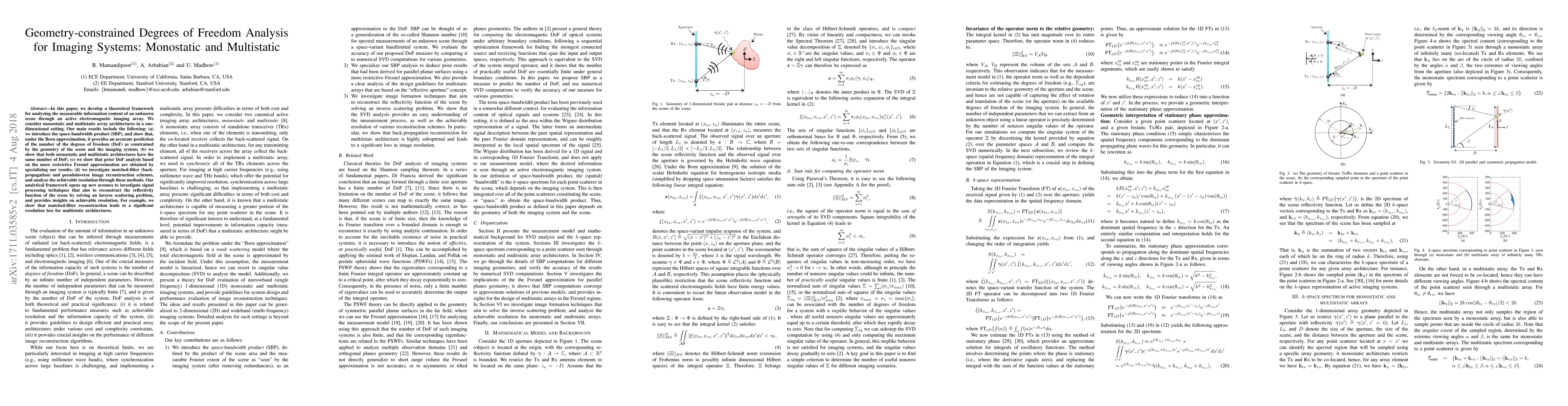 This paper develops a theoretical framework to analyze the measurable information content of an unknown scene using active electromagnetic imaging arrays, introducing the space-bandwidth product (SBP) to predict degrees of freedom (DoF) constrained by geometry. It finds that monostatic and multistatic architectures have the same DoF and provides insights into image reconstruction techniques, showing significant resolution loss with matched-filter reconstruction for multistatic setups.