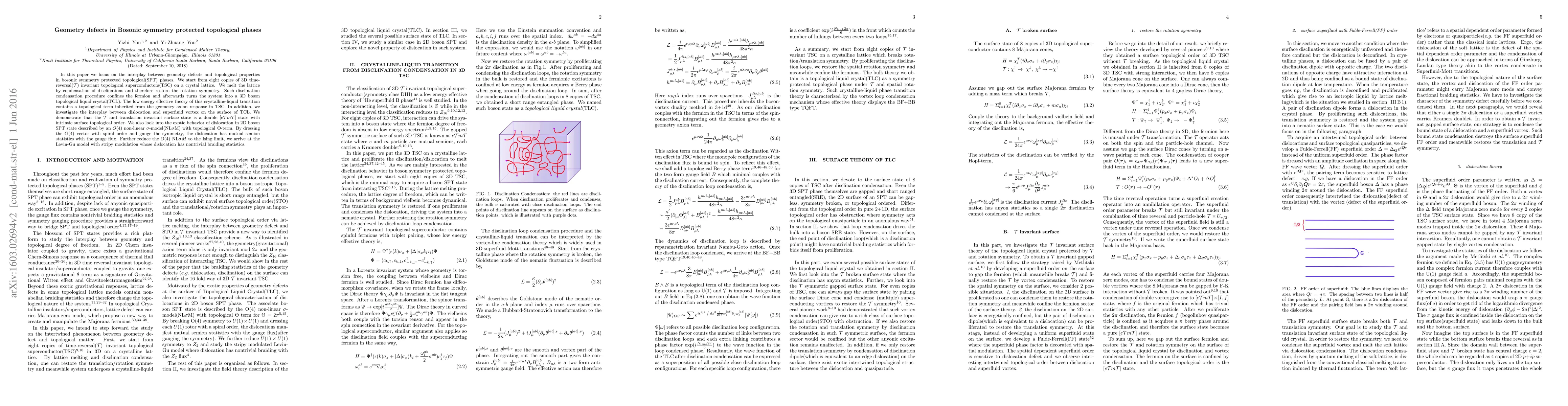 In this paper we focus on the interplay between geometry defects and topological properties in bosonic symmetry protected topological(SPT) phases. We start from eight copies of 3D time-reversal($\mathcal{T}$) invariant topological superconductors(TSC) on a crystal lattice. We melt the lattice by condensation of disclinations and therefore restore the rotation symmetry. Such disclination condensation procedure confines the fermion and afterwards turns the system into a 3D boson topological liquid crystal(TCL). The low energy effective theory of this crystalline-liquid transition contains a topological term inherited from the geometry axion response in TSC. In addition, we investigate the interplay between dislocation and superfluid vortex on the surface of TCL. We demonstrate that the $\mathcal{T}$ and translation invariant surface state is a double $[e\mathcal{T}m\mathcal{T}]$ state with intrinsic surface topological order. We also look into the exotic behavior of dislocation in 2D boson SPT state described by an $O(4)$ non-linear $\sigma$-model(NL$\sigma $M) with topological $\Theta$-term. By dressing the $O(4)$ vector with spiral order and gauge the symmetry, the dislocation has mutual semion statistics with the gauge flux. Further reduce the $O(4)$ NL$\sigma M$ to the Ising limit, we arrive at the Levin-Gu model with stripy modulation whose dislocation has nontrivial braiding statistics.