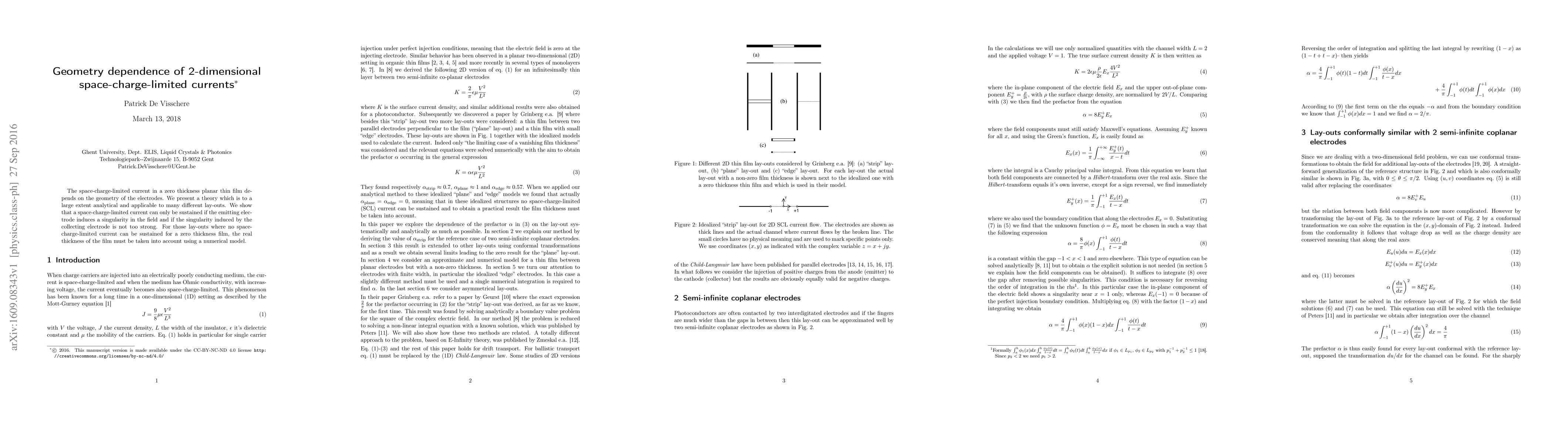 The space-charge-limited current in a zero thickness planar thin film depends on the geometry of the electrodes. We present a theory which is to a large extent analytical and applicable to many different lay-outs. We show that a space-charge-limited current can only be sustained if the emitting electrode induces a singularity in the field and if the singularity induced by the collecting electrode is not too strong. For those lay-outs where no space-charge-limited current can be sustained for a zero thickness film, the real thickness of the film must be taken into account using a numerical model.