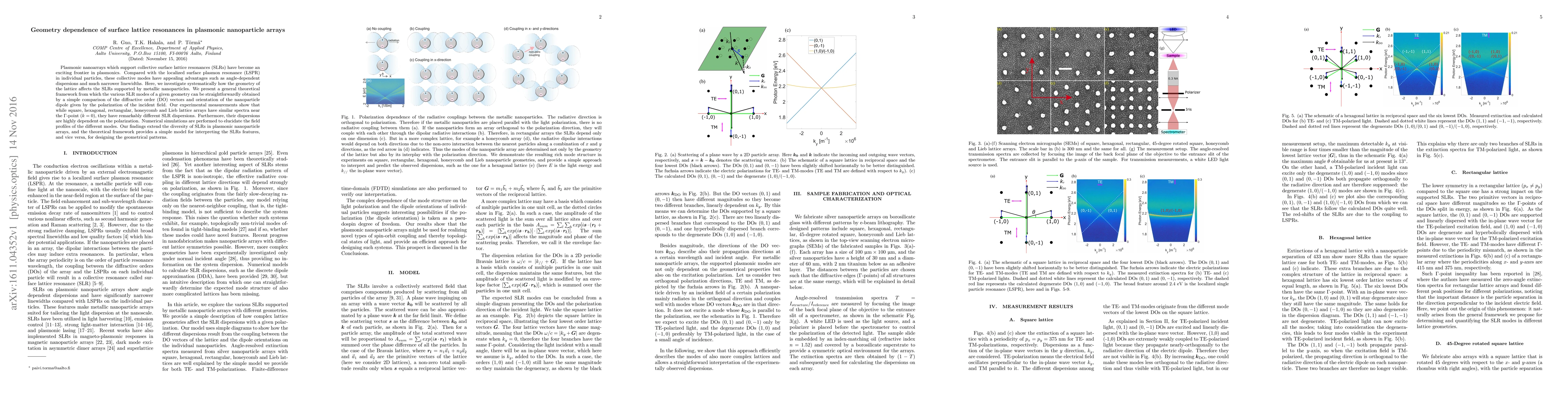 Plasmonic nanoarrays which support collective surface lattice resonances (SLRs) have become an exciting frontier in plasmonics. Compared with the localized surface plasmon resonance (LSPR) in individual particles, these collective modes have appealing advantages such as angle-dependent dispersions and much narrower linewidths. Here, we investigate systematically how the geometry of the lattice affects the SLRs supported by metallic nanoparticles. We present a general theoretical framework from which the various SLR modes of a given geometry can be straightforwardly obtained by a simple comparison of the diffractive order (DO) vectors and orientation of the nanoparticle dipole given by the polarization of the incident field. Our experimental measurements show that while square, hexagonal, rectangular, honeycomb and Lieb lattice arrays have similar spectra near the $\Gamma$-point ($k=0$), they have remarkably different SLR dispersions. Furthermore, their dispersions are highly dependent on the polarization. Numerical simulations are performed to elucidate the field profiles of the different modes. Our findings extend the diversity of SLRs in plasmonic nanoparticle arrays, and the theoretical framework provides a simple model for interpreting the SLRs features, and vice versa, for designing the geometrical patterns.