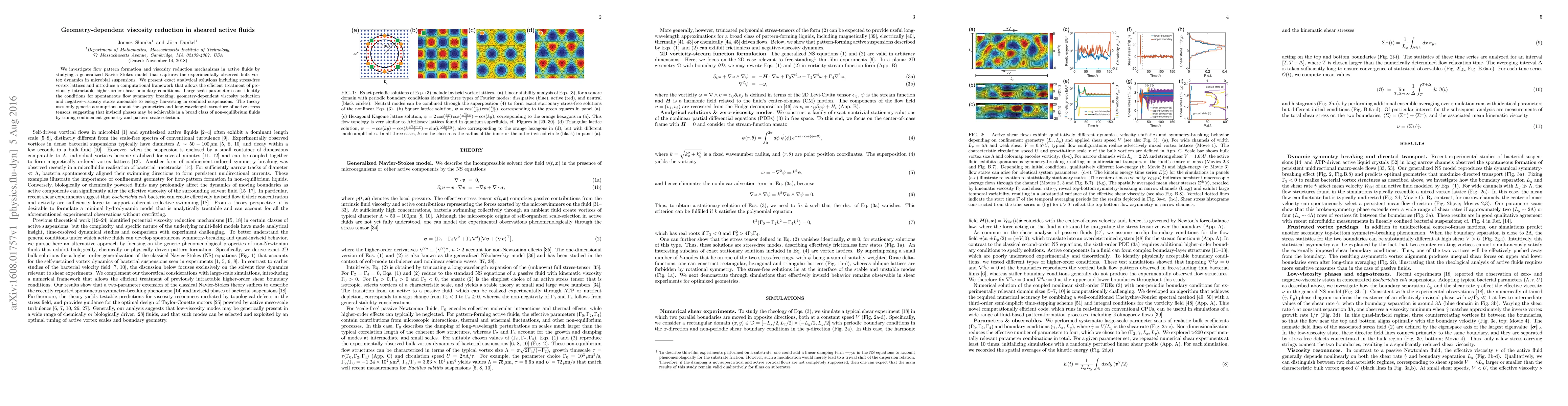 We investigate flow pattern formation and viscosity reduction mechanisms in active fluids by studying a generalized Navier-Stokes model that captures the experimentally observed bulk vortex dynamics in microbial suspensions. We present exact analytical solutions including stress-free vortex lattices and introduce a computational framework that allows the efficient treatment of previously intractable higher-order shear boundary conditions. Large-scale parameter scans identify the conditions for spontaneous flow symmetry breaking, geometry-dependent viscosity reduction and negative-viscosity states amenable to energy harvesting in confined suspensions. The theory uses only generic assumptions about the symmetries and long-wavelength structure of active stress tensors, suggesting that inviscid phases may be achievable in a broad class of non-equilibrium fluids by tuning confinement geometry and pattern scale selection.