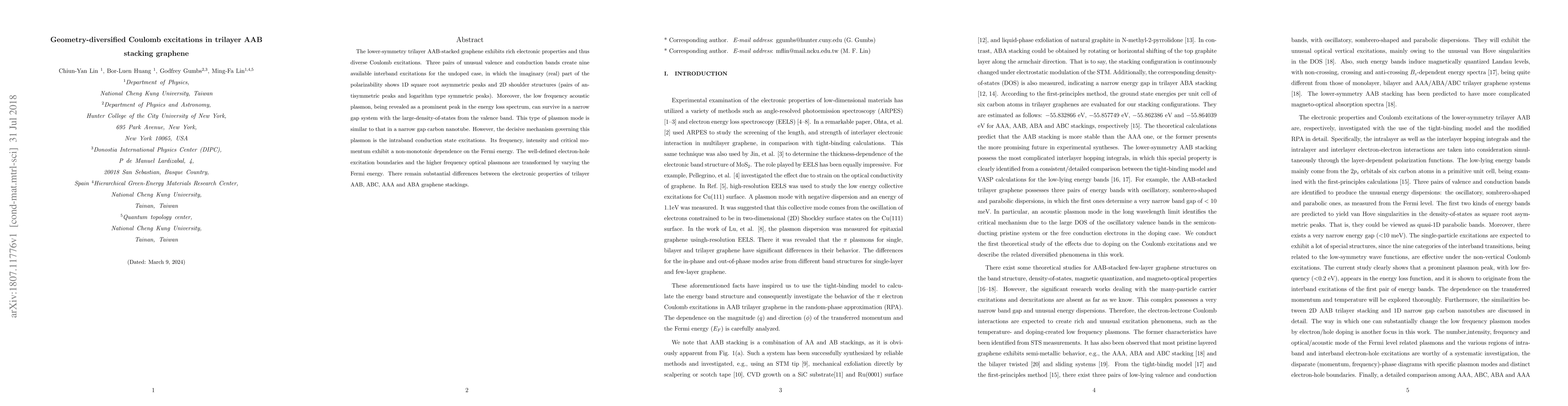 This paper explores the unique electronic properties and Coulomb excitations in trilayer AAB-stacked graphene, revealing diverse interband excitations and a low-frequency acoustic plasmon with non-monotonic dependence on Fermi energy, distinct from other graphene stackings. The study highlights the complex polarizability and plasmon behavior in this lower-symmetry structure.