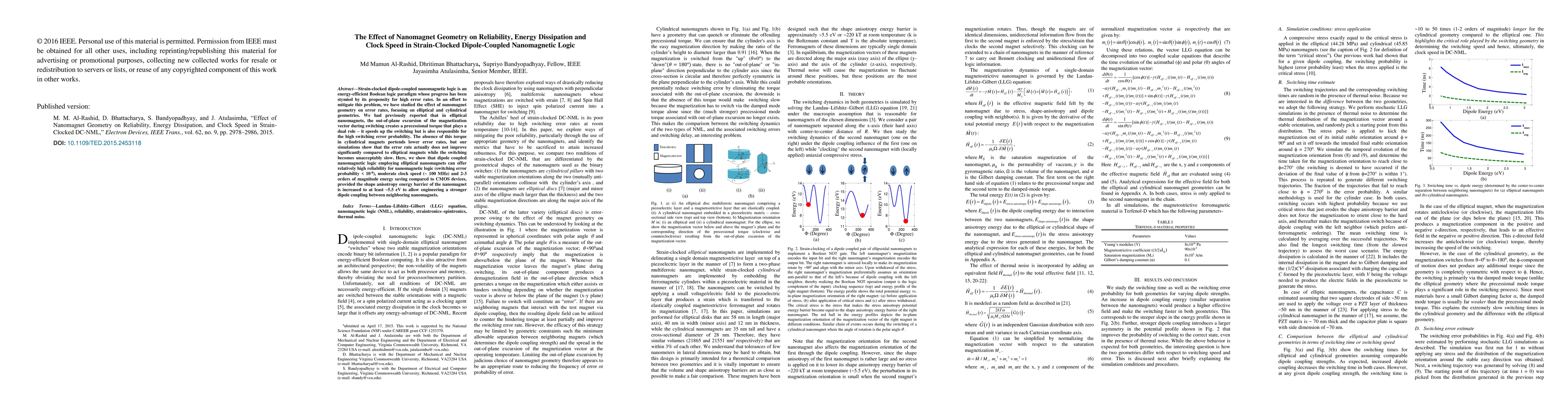 Strain-clocked dipole-coupled nanomagnetic logic is an energy-efficient Boolean logic paradigm whose progress has been stymied by its propensity for high error rates. In an effort to mitigate this problem, we have studied the effect of nanomagnet geometry on error rates, focusing on elliptical and cylindrical geometries. We had previously reported that the out-of-plane excursion of the magnetization vector during switching creates a precessional torque that is responsible for high switching error probability in elliptical nanomagnet geometries. The absence of this torque in cylindrical magnets portends lower error rates, but our simulations show that the error rate actually does not improve significantly compared to elliptical magnets while the switching becomes unacceptably slow. Here, we show that dipole coupled nanomagnetic logic can offer relatively high reliability (switching error probability < 10^-8), moderate clock speed (~ 100 MHz) and 2-3 orders of magnitude energy saving compared to CMOS devices, provided the shape anisotropy energy barrier of the magnet is increased to at least ~5.5 eV to allow engineering a stronger dipole coupling between neighboring nanomagnets.