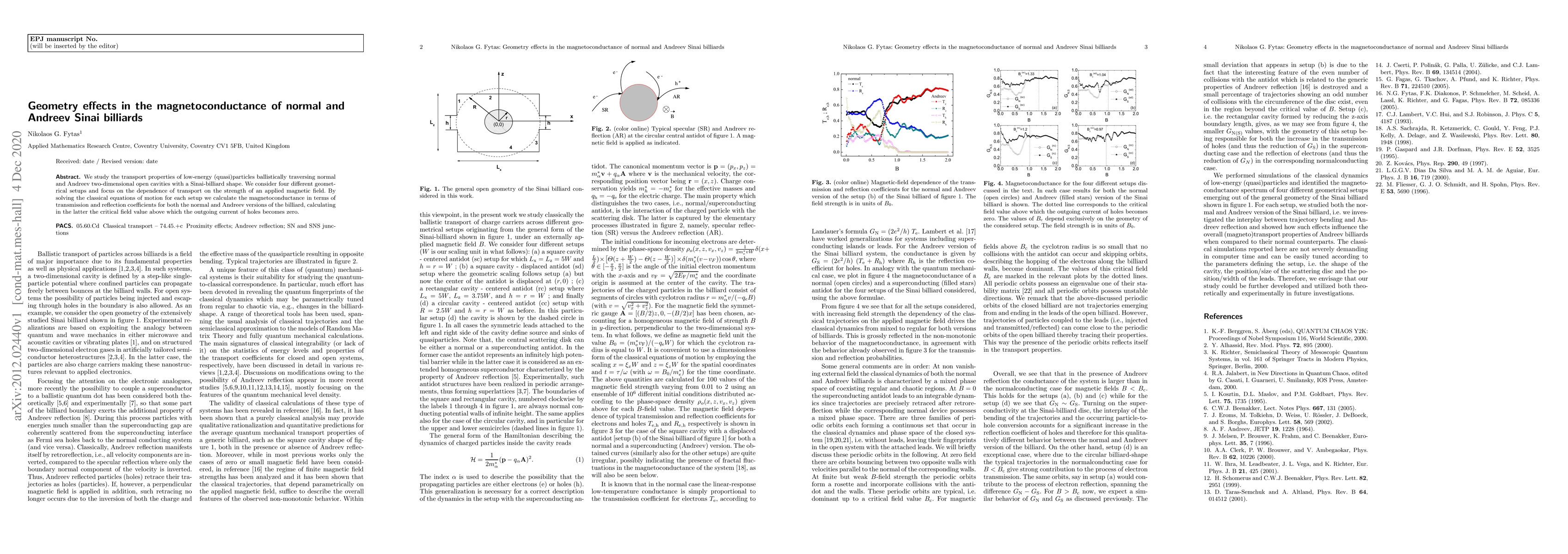We study the transport properties of low-energy (quasi)particles ballistically traversing normal and Andreev two-dimensional open cavities with a Sinai-billiard shape. We consider four different geometrical setups and focus on the dependence of transport on the strength of an applied magnetic field. By solving the classical equations of motion for each setup we calculate the magnetoconductance in terms of transmission and reflection coefficients for both the normal and Andreev versions of the billiard, calculating in the latter the critical field value above which the outgoing current of holes becomes zero.