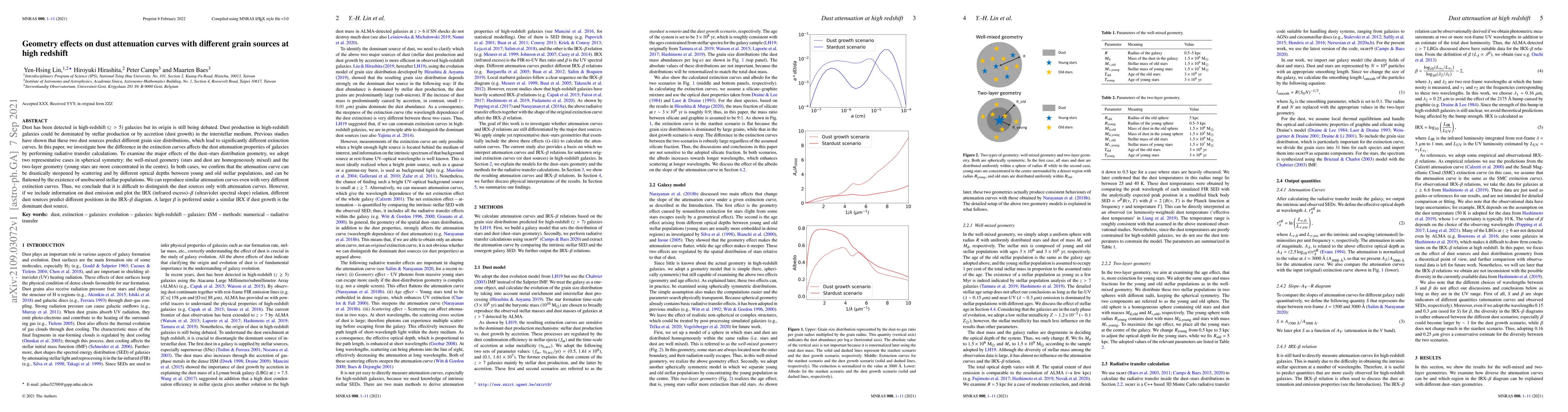 This paper examines how different dust sources and geometries affect dust attenuation curves in high-redshift galaxies, finding that attenuation curves can vary significantly despite different grain size distributions. It concludes that distinguishing dust sources solely by attenuation curves is challenging, but the IRX-$\beta$ relation can provide additional insights into the dominant dust source.