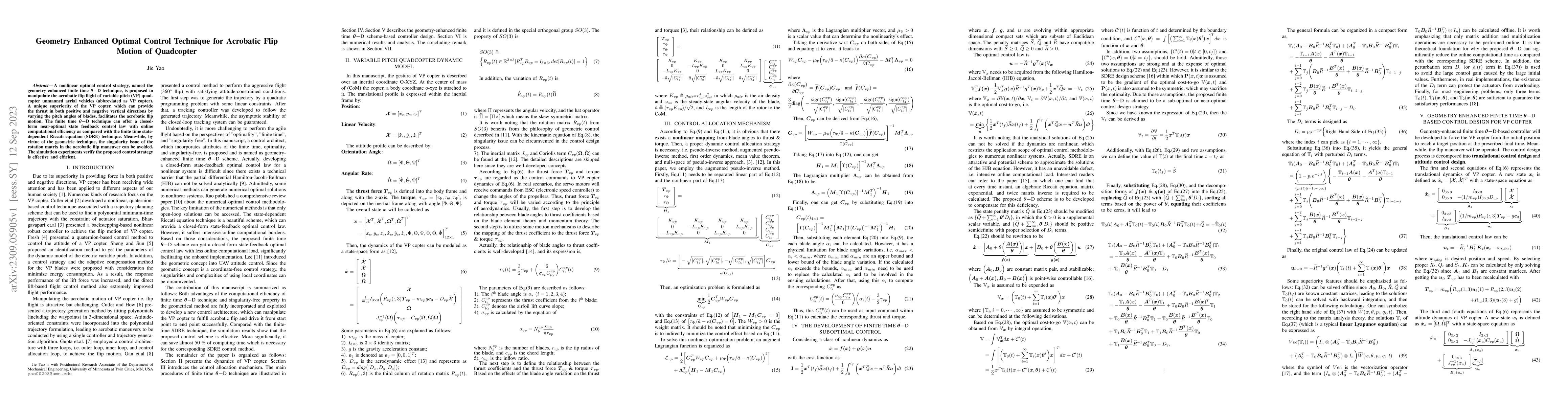 A nonlinear optimal control strategy, named the geometry enhanced finite time $\boldsymbol{\theta-}$D technique, is proposed to manipulate the acrobatic flip flight of variable pitch (VP) quadcopter unmanned aerial vehicles (abbreviated as VP copter). A unique superiority of the VP copter, which can provide the thrust in both positive and negative vertical directions by varying the pitch angles of blades, facilitates the acrobatic flip motion. The finite time $\boldsymbol{\theta-}$D technique can offer a closed-form near-optimal state feedback control law with online computational efficiency as compared with the finite time state-dependent Riccati equation (SDRE) technique. Meanwhile, by virtue of the geometric technique, the singularity issue of the rotation matrix in the acrobatic flip maneuver can be avoided. The simulation experiments verify the proposed control strategy is effective and efficient.