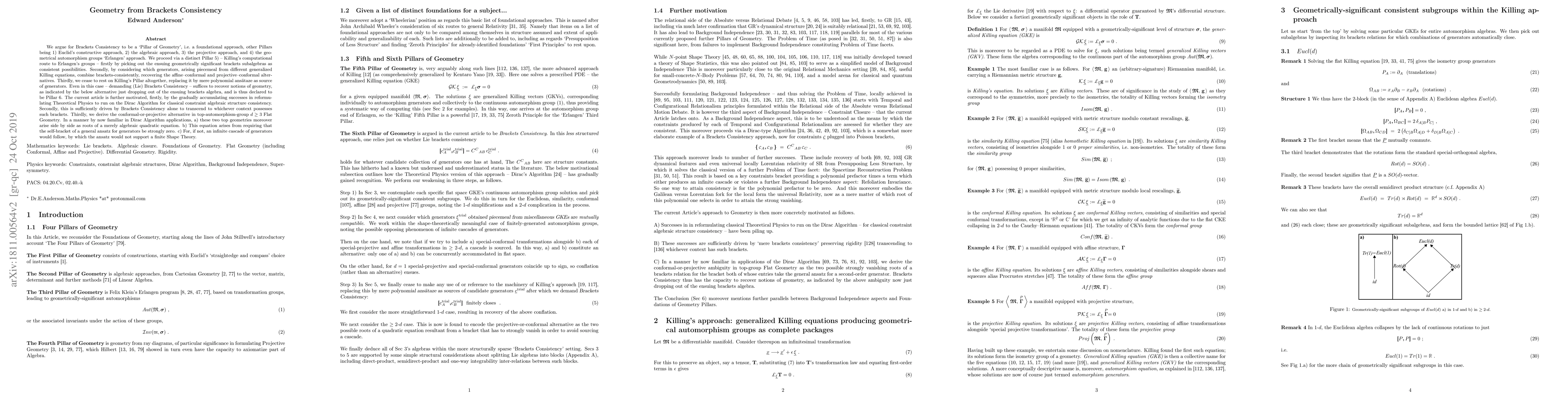 We argue for Brackets Consistency to be a `Pillar of Geometry', i.e. a foundational approach, other Pillars being 1) Euclid's constructive approach, 2) the algebraic approach, 3) the projective approach, and 4) the geometrical automorphism groups `Erlangen' approach. We proceed via a distinct Pillar 5) - Killing's computational route to Erlangen's groups - firstly by picking out the ensuing geometrically significant brackets subalgebras as consistent possibilities. Secondly, by considering which generators, arising piecemeal from different generalized Killing equations, combine brackets-consistently, recovering the affine-conformal and projective-conformal alternatives. Thirdly, we cease to rest on Killing's Pillar altogether, replacing it by mere polynomial ans\"{a}taze as source of generators. Even in this case - demanding (Lie) Brackets Consistency - suffices to recover notions of geometry, as indicated by the below alternative just dropping out of the ensuing brackets algebra, and is thus declared to be Pillar 6. The current article is further motivated, firstly, by the gradually accumulating successes in reformulating Theoretical Physics to run on the Dirac Algorithm for classical constraint algebraic structure consistency. Secondly, this is sufficiently driven by Brackets Consistency alone to transcend to whichever context possesses such brackets. Thirdly, we derive the conformal-or-projective alternative in top-automorphism-group $d \geq 3$ Flat Geometry. In a manner by now familiar in Dirac Algorithm applications, a) these two top geometries moreover arise side by side as roots of a merely algebraic quadratic equation. b) This equation arises from requiring that the self-bracket of a general ansatz for generators be strongly zero. c) For, if not, an infinite cascade of generators would follow, by which the ansatz would not support a finite Shape Theory.
