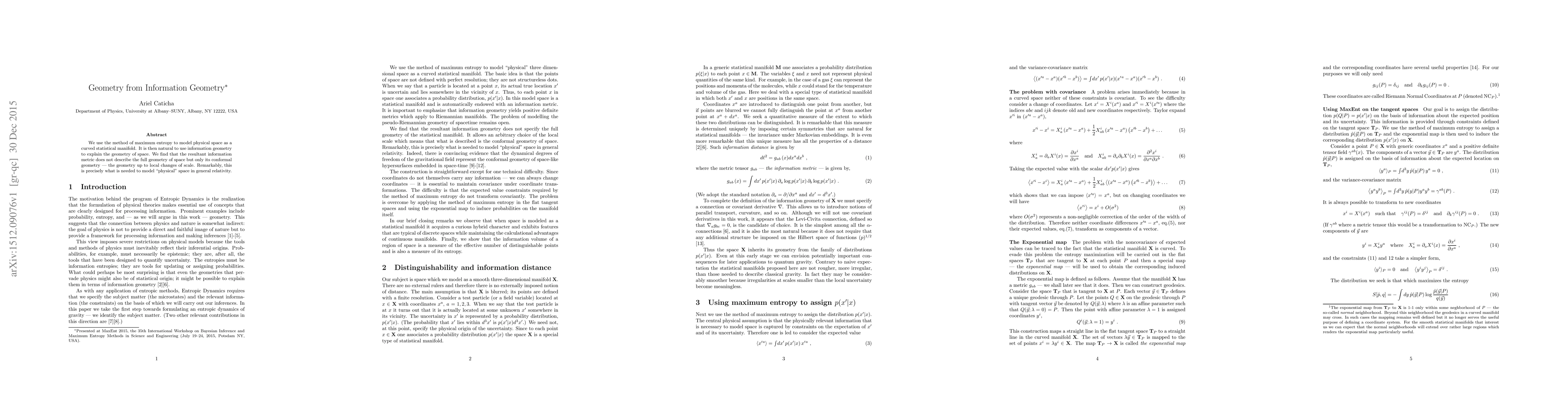 This paper models physical space as a curved statistical manifold using maximum entropy, employing information geometry to describe its conformal geometry, which aligns with the requirements of general relativity for modeling "physical" space.