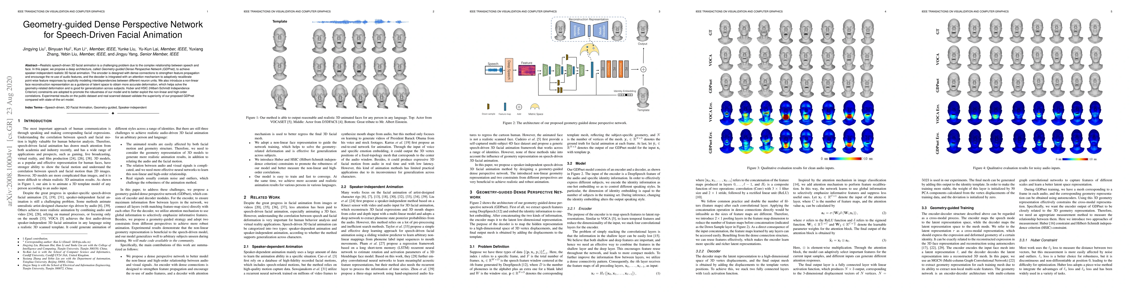 The paper proposes a Geometry-guided Dense Perspective Network (GDPnet) for realistic, speaker-independent 3D facial animation, utilizing dense connections and attention mechanisms to enhance feature propagation and adaptively recalibrate feature responses, along with non-linear face reconstruction guidance and robustness constraints. Experimental results show GDPnet outperforms state-of-the-art models on both public and real datasets.