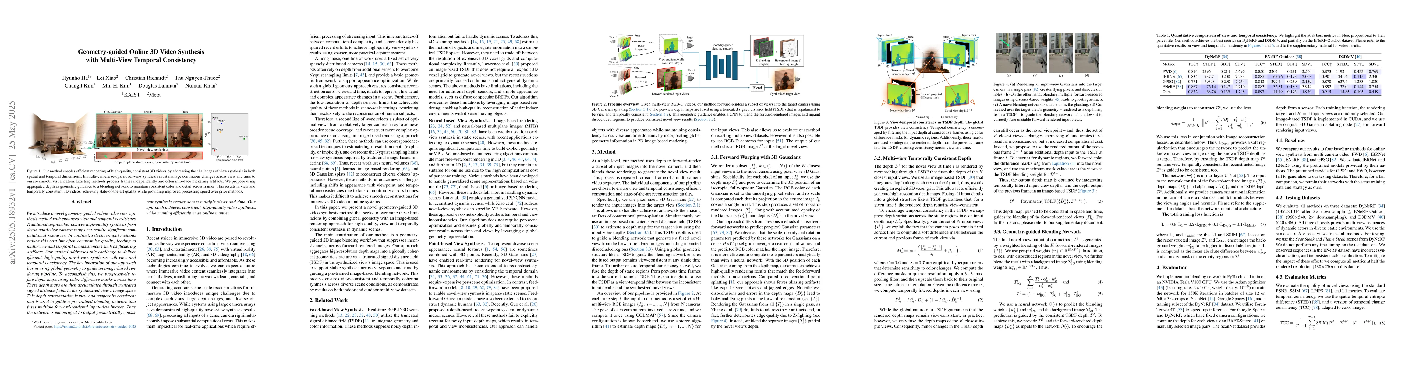 This work stands out by integrating geometry-guided depth refinement with an image-based rendering pipeline for online 3D video synthesis, enhancing both efficiency and consistency compared to existing selective-input methods.