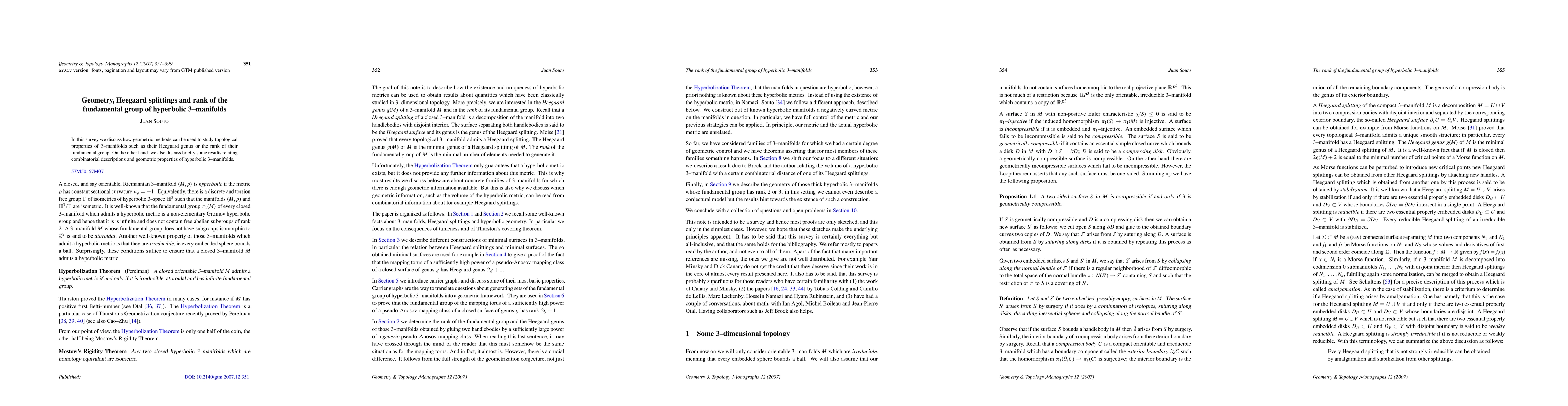Summary: This survey explores the use of geometric methods to analyze topological properties of 3-manifolds, focusing on Heegaard genus and fundamental group rank, and briefly touches on the relationship between combinatorial and geometric characteristics of hyperbolic 3-manifolds.