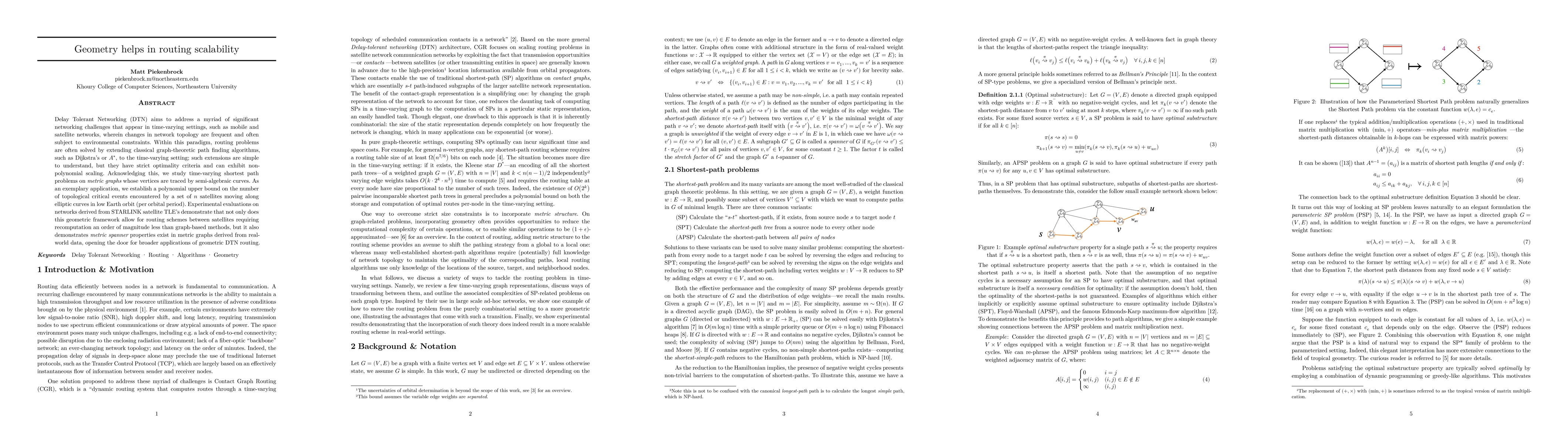 Delay Tolerant Networking (DTN) aims to address a myriad of significant networking challenges that appear in time-varying settings, such as mobile and satellite networks, wherein changes in network topology are frequent and often subject to environmental constraints. Within this paradigm, routing problems are often solved by extending classical graph-theoretic path finding algorithms, such as the Bellman-Ford or Floyd-Warshall algorithms, to the time-varying setting; such extensions are simple to understand, but they have strict optimality criteria and can exhibit non-polynomial scaling. Acknowledging this, we study time-varying shortest path problems on metric graphs whose vertices are traced by semi-algebraic curves. As an exemplary application, we establish a polynomial upper bound on the number of topological critical events encountered by a set of $n$ satellites moving along elliptic curves in low Earth orbit (per orbital period). Experimental evaluations on networks derived from STARLINK satellite TLE's demonstrate that not only does this geometric framework allow for routing schemes between satellites requiring recomputation an order of magnitude less than graph-based methods, but it also demonstrates metric spanner properties exist in metric graphs derived from real-world data, opening the door for broader applications of geometric DTN routing.