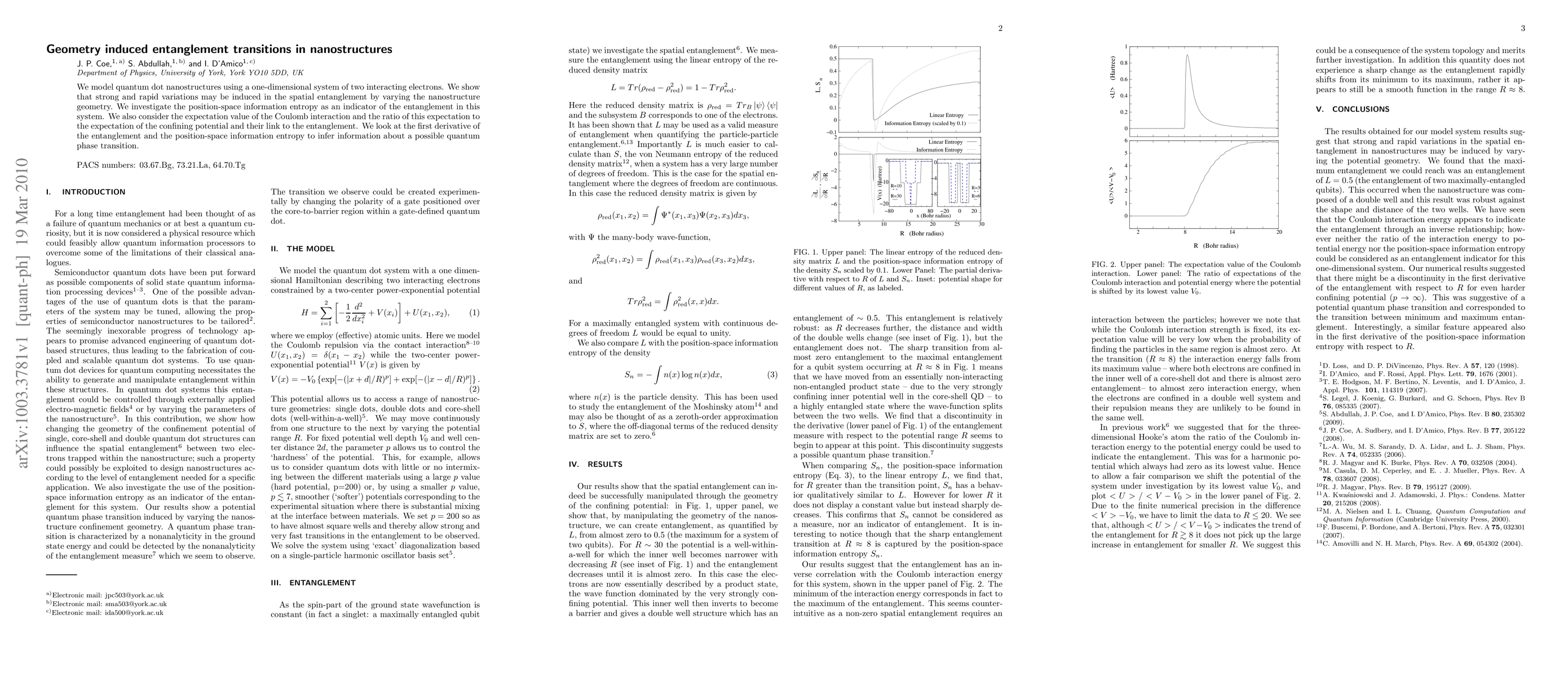 We model quantum dot nanostructures using a one-dimensional system of two interacting electrons. We show that strong and rapid variations may be induced in the spatial entanglement by varying the nanostructure geometry. We investigate the position-space information entropy as an indicator of the entanglement in this system. We also consider the expectation value of the Coulomb interaction and the ratio of this expectation to the expectation of the confining potential and their link to the entanglement. We look at the first derivative of the entanglement and the position-space information entropy to infer information about a possible quantum phase transition.