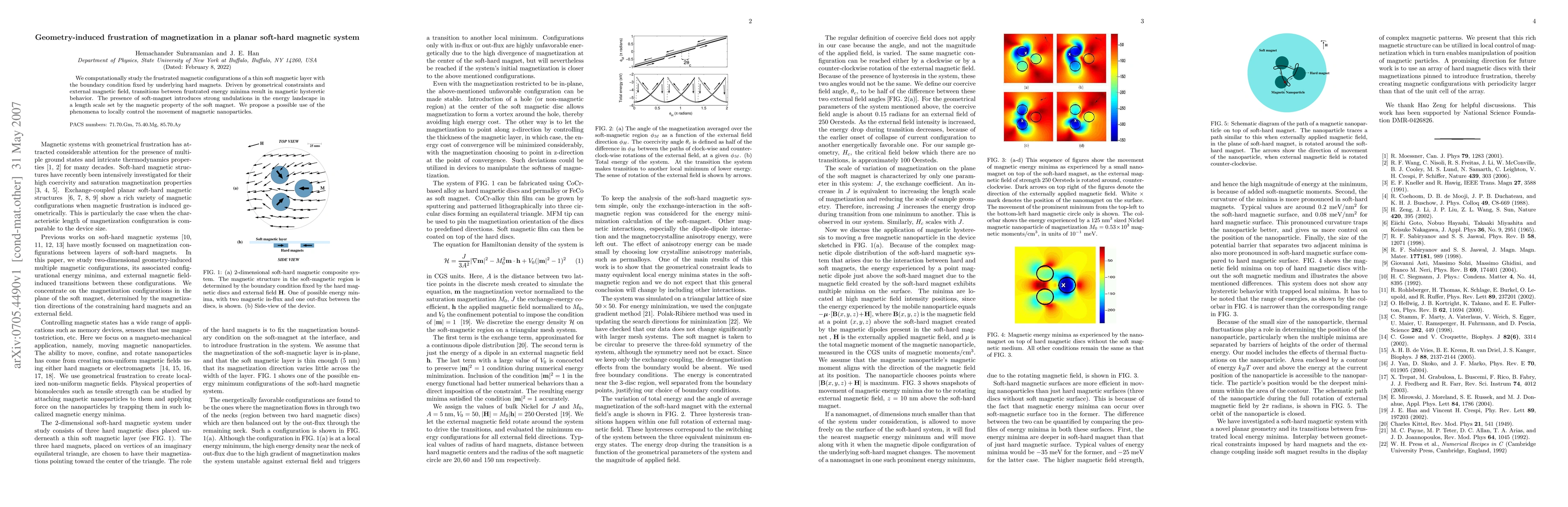 We computationally study the frustrated magnetic configurations of a thin soft magnetic layer with the boundary condition fixed by underlying hard magnets. Driven by geometrical constraints and external magnetic field, transitions between frustrated energy minima result in magnetic hysteretic behavior. The presence of soft-magnet introduces strong undulations in the energy landscape in a length scale set by the magnetic property of the soft magnet. We propose a possible use of the phenomena to locally control the movement of magnetic nanoparticles.
