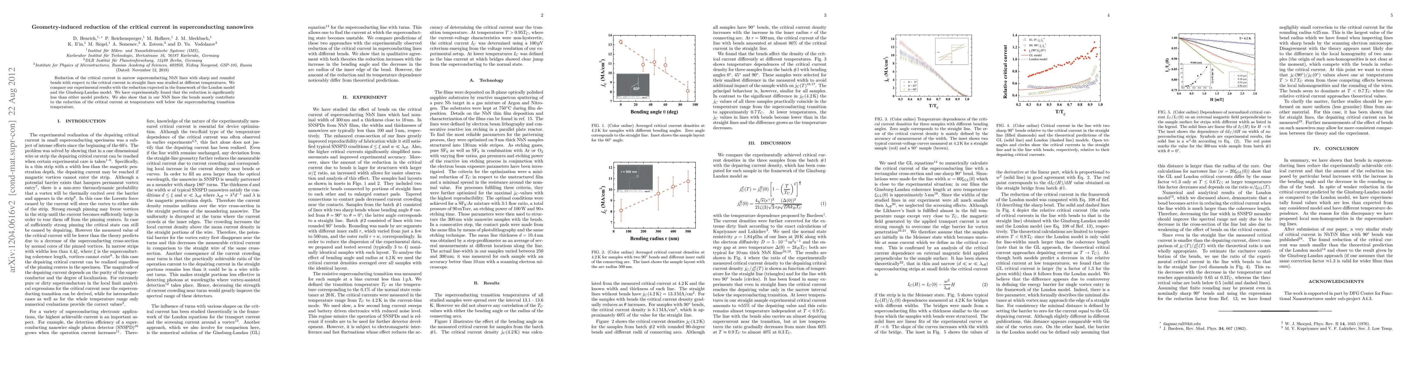 This study investigates the reduction of critical current in narrow NbN superconducting nanowires with sharp and rounded bends compared to straight lines, finding that experimental results show significantly less reduction than predicted by the London and Ginzburg-Landau models, especially at temperatures below the superconducting transition.
