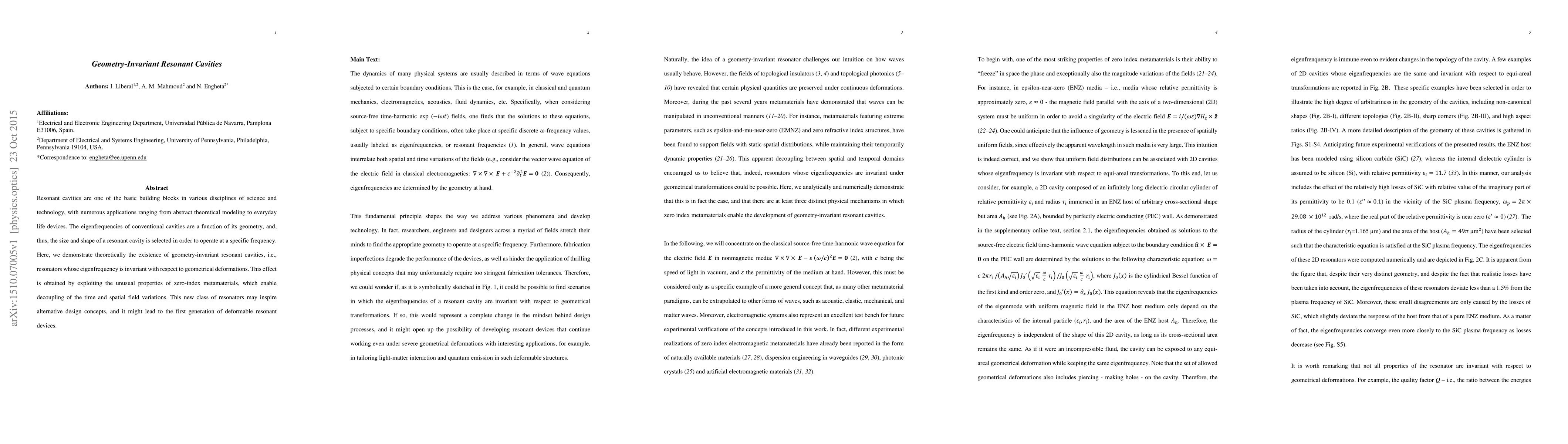 This paper demonstrates the existence of geometry-invariant resonant cavities whose eigenfrequencies remain constant despite geometrical deformations, achieved through the unique properties of zero-index metamaterials. This discovery could inspire new design concepts for deformable resonant devices.