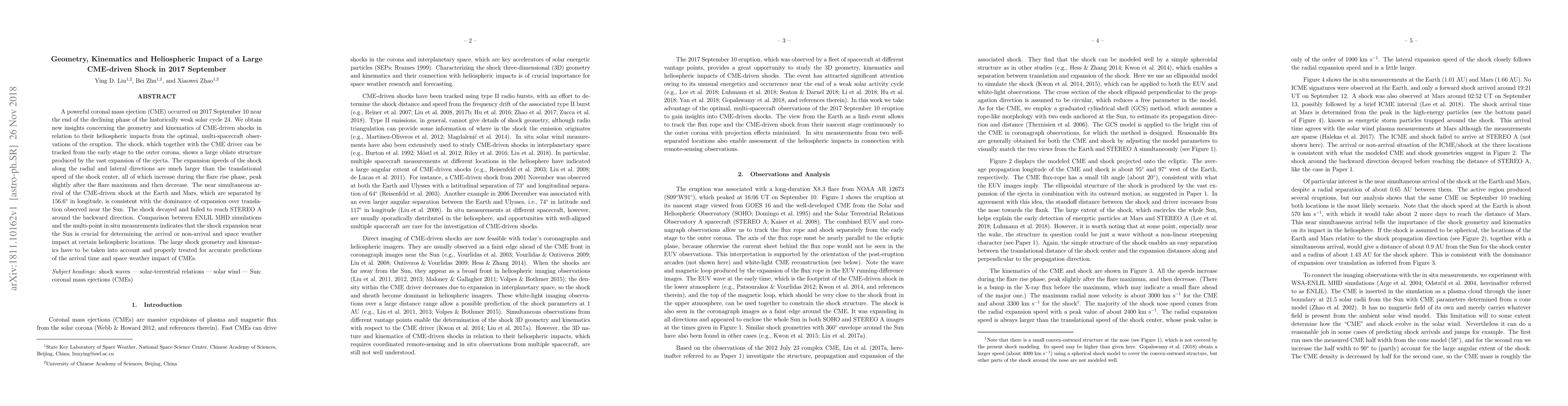 A 2017 CME-driven shock showed large oblate structure expansion speeds that increased during a solar flare, impacting Earth and Mars with near-simultaneous arrival times. Accurate predictions of space weather require accounting for the shock's geometry and kinematics.