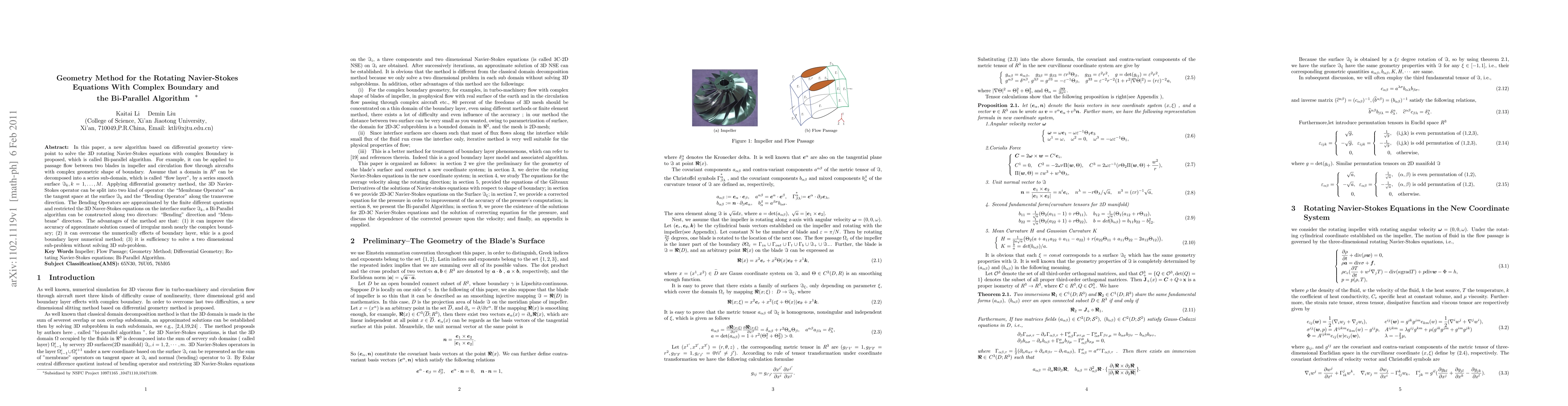 In this paper, a new algorithm based on differential geometry viewpoint to solve the 3D rotating Navier-Stokes equations with complex Boundary is proposed, which is called Bi-parallel algorithm. For xample, it can be applied to passage flow between two blades in impeller and circulation flow through aircrafts with complex geometric shape of boundary. Assume that a domain in $R^3$ can be decomposed into a series sub-domain, which is called "flow layer", by a series smooth surface $\Im_k, k=1,...,M$. Applying differential geometry method, the 3D Navier-Stokes operator can be split into two kind of operator: the "Membrane Operator" on the tangent space at the surface $\Im_k$ and the "Bending Operator" along the transverse direction. The Bending Operators are approximated by the finite different quotients and restricted the 3D Naver-Stokes equations on the interface surface $\Im_k$, a Bi-Parallel algorithm can be constructed along two directors: "Bending" direction and "Membrane" directors. The advantages of the method are that: (1) it can improve the accuracy of approximate solution caused of irregular mesh nearly the complex boundary; (2) it can overcome the numerically effects of boundary layer, whic is a good boundary layer numerical method; (3) it is sufficiency to solve a two dimensional sub-problem without solving 3D sub-problem.