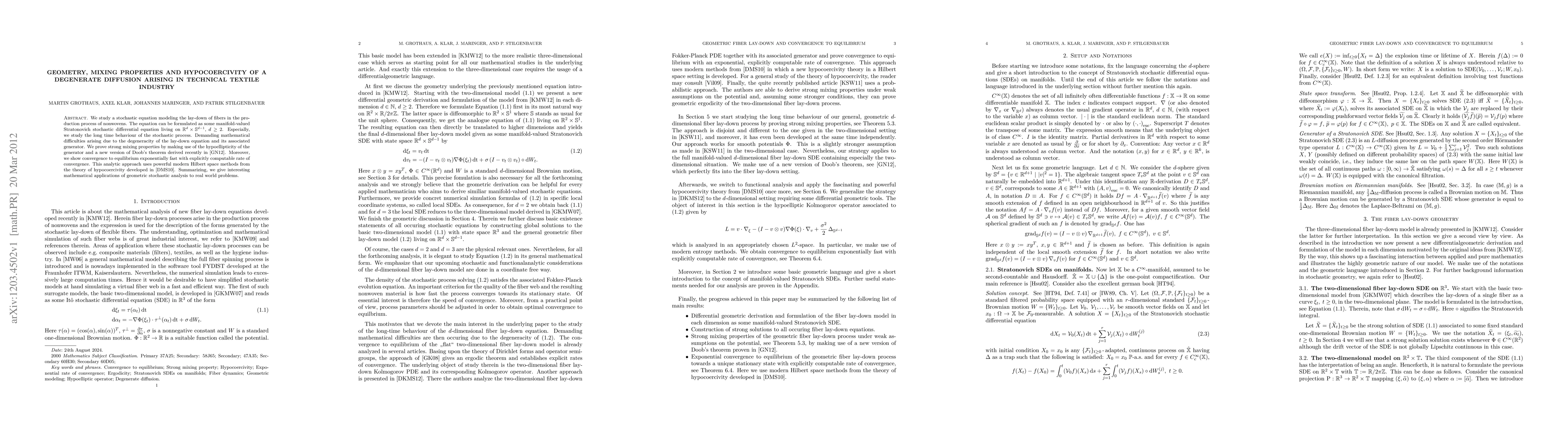 We study a stochastic equation modeling the lay-down of fibers in the production process of nonwovens. The equation can be formulated as some manifold-valued Stratonovich stochastic differential equation. Especially, we study the long time behaviour of the stochastic process. Demanding mathematical difficulties arising due to the degeneracity of the lay-down equation and its associated generator. We prove strong mixing properties by making use of the hypoellipticity of the generator and a new version of Doob's theorem derived recently by Gerlach and Nittka. Moreover, we show convergence to equilibrium exponentially fast with explicitly computable rate of convergence. This analytic approach uses powerful modern Hilbert space methods from the theory of hypocoercivity developed by Dolbeault, Mouhot and Schmeiser. Summarizing, we give interesting mathematical applications of geometric stochastic analysis to real world problems.