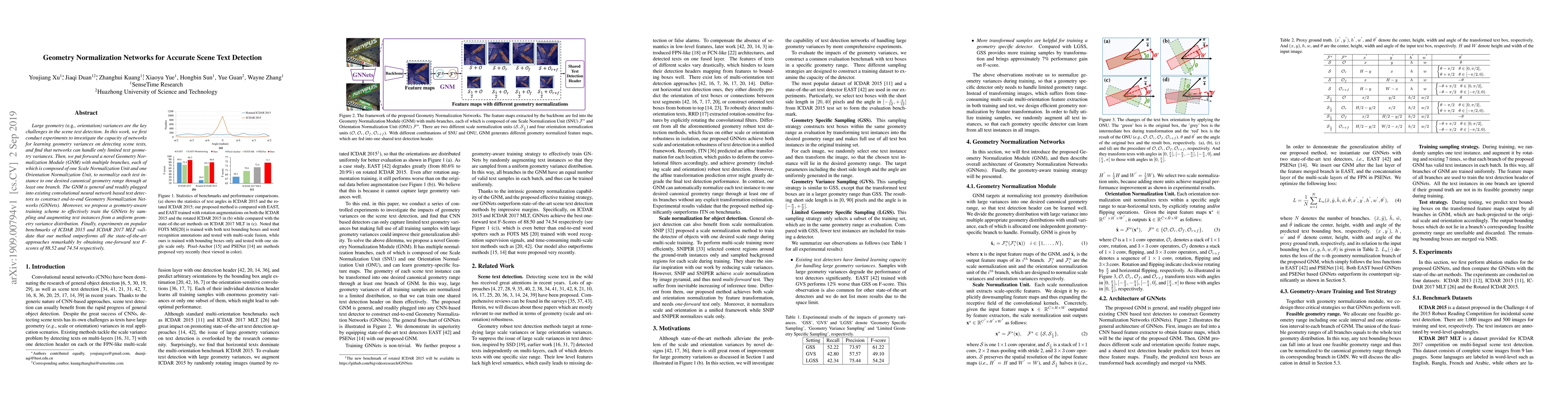 This paper proposes a novel approach to scene text detection that leverages Geometry Normalization Modules to normalize text instances to a desired canonical geometry range, outperforming state-of-the-art methods on ICDAR 2015 and 2017 benchmarks.