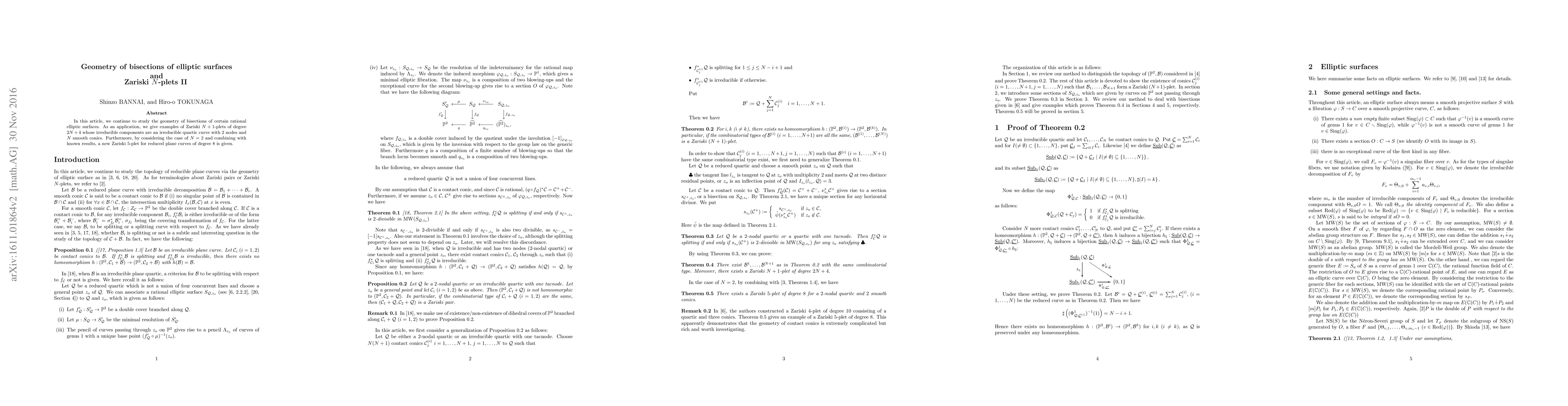In this article, we continue to study the geometry of bisections of certain rational elliptic surfaces. As an application, we give examples of Zariski N + 1-plets of degree 2N + 4 whose irreducible components are an irreducible quartic curve with 2 nodes and N smooth conics. Furthermore, by considering the case of N = 2 and combining with known results, a new Zariski 5-plet for reduced plane curves of degree 8 is given.