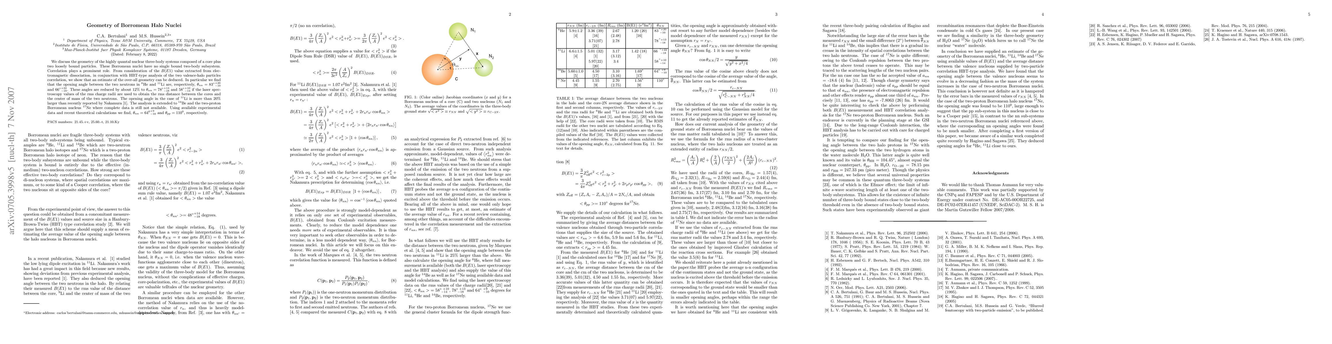 We discuss the geometry of the highly quantal nuclear three-body systems composed of a core plus two loosely bound particles. These Borromean nuclei have no single bound two-body subsystem. Correlation plays a prominent role. From consideration of the $B(E1)$ value extracted from electromagnetic dissociation, in conjunction with HBT-type analysis of the two valence-halo particles correlation, we show that an estimate of the over-all geometry can be deduced. In particular we find that the opening angle between the two neutrons in $^{6}$He and $^{11}$Li are, respectively, $\theta_{nn} = {83^{\circ}}^{+20}_{-10}$ and ${66^{\circ}}^{+22}_{-18}$. These angles are reduced by about 12% to $\theta_{nn} = {78^{\circ}}^{+13}_{-18}$ and ${58^{\circ}}^{+10}_{-14}$ if the laser spectroscopy values of the rms charge radii are used to obtain the rms distance between the cores and the center of mass of the two neutrons. The opening angle in the case of $^{11}$Li is more than 20% larger than recently reported by Nakamura \cite{Nak06}. The analysis is extended to $^{14}$Be and the two-proton Borromean nucleus $^{17}% $Ne where complete data is still not available. Using available experimental data and recent theoretical calculations we find, $\theta_{nn} = {64^{0}}^{+9}_{-10}$ and $\theta_{pp} = 110^{0}$, respectively.