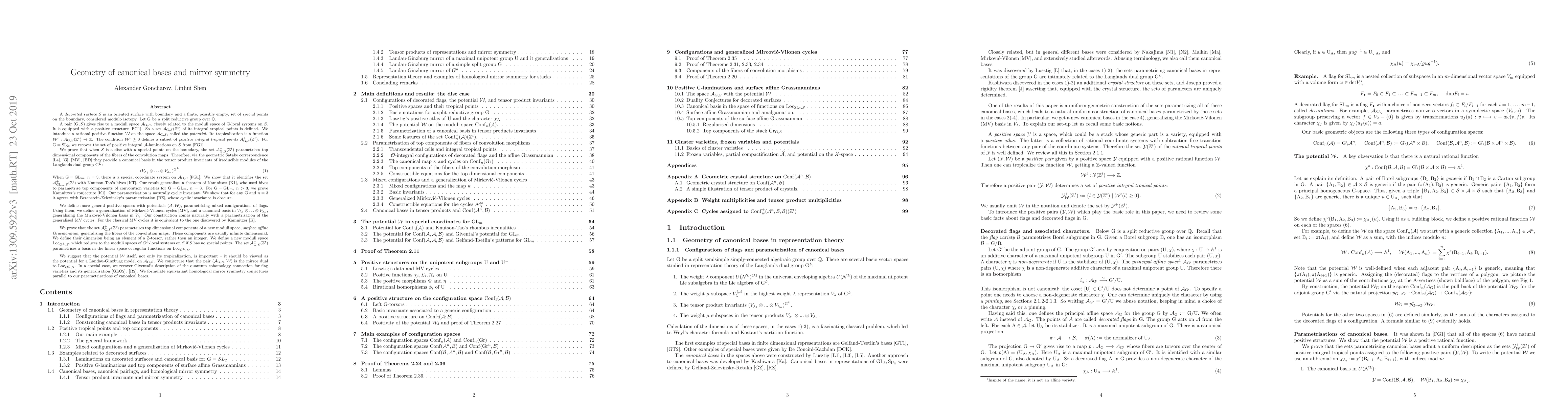 A decorated surface S is a surface with a finite set of special points on the boundary, considered modulo isotopy. Let G be a split reductive group. A pair (G, S) gives rise to a moduli space A(G, S), closely related to the space of G-local systems on S. It has a positive structure. So the set of its integral tropical points is defined. We introduce a rational positive function W on A(G, S), the potential. The condition that its tropicalisation is non-negative determines its subset. For SL(2), we recover the set of integral laminations on S. We prove that when S is a disc with n special points on the boundary, this set parametrises top dimensional components of the convolution varieties. Thus, via geometric Satake correspondence, they provide a canonical basis in tensor product invariants of irreducible modules for the Langlands dual group. When G=GL(m), n=3, there is a special coordinate system on A(G,S). We show that it identifies our set with the set of with Knutson-Tao's hives. Our result generalises a theorem of Kamnitzer, who used hives to parametrise top components of convolution varieties for GL(m), n=3. For n>3, we prove Kamnitzer's conjecture. We define canonical bases in tensor products, generalizing the Mirkovic-Vilonen basis in a single representation. We prove that for any S, the set of positive integral tropical points of A(G, S) parametrise top components in a new space, surface affine Grasmannian. We view W as a potential for Landau-Ginzburg model on A(G,S). We conjecture that the pair (A(G,S), W) is the mirror dual to the moduli space of local systems on S for the Langlands dual group. In a special case, we recover Givental's description of the quantum cohomology connection for flag varieties.