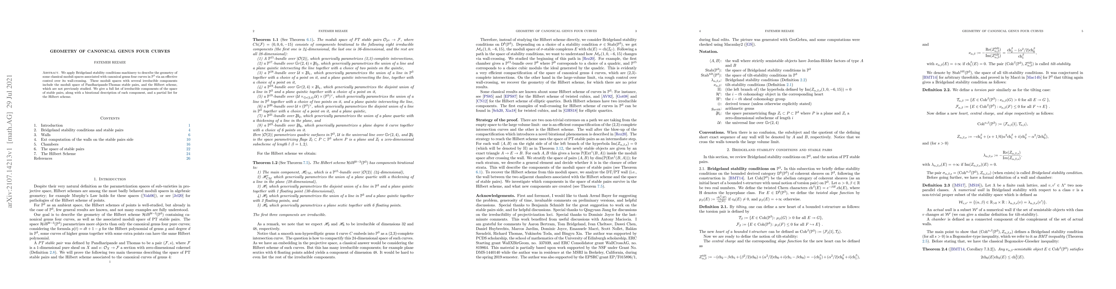 This paper uses Bridgeland stability conditions to analyze the geometry of moduli spaces associated with canonical genus four curves in $\mathbb{P}^3$, detailing irreducible components and their birational descriptions, particularly for the moduli space of Pandharipande-Thomas stable pairs and the Hilbert scheme.