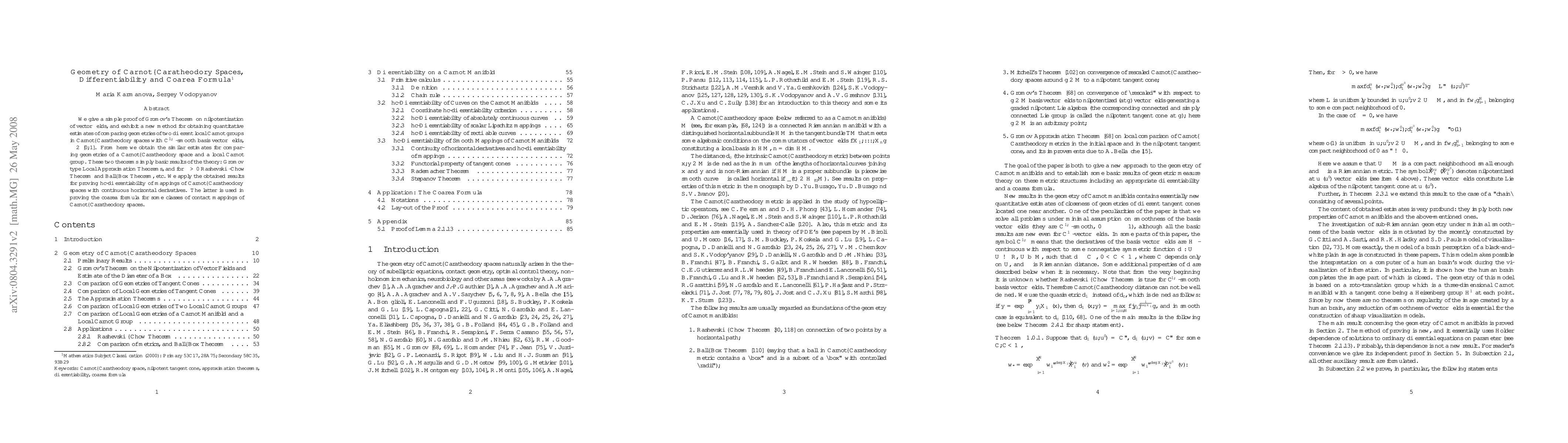 This paper presents a straightforward proof of Gromov's Theorem on nilpotentization of vector fields and develops a novel approach for estimating geometry comparisons between local Carnot groups in Carnot-Carathéodory spaces. The results also imply several foundational theorems and enable the proof of $hc$-differentiability of mappings, leading to the coarea formula for specific contact mappings.