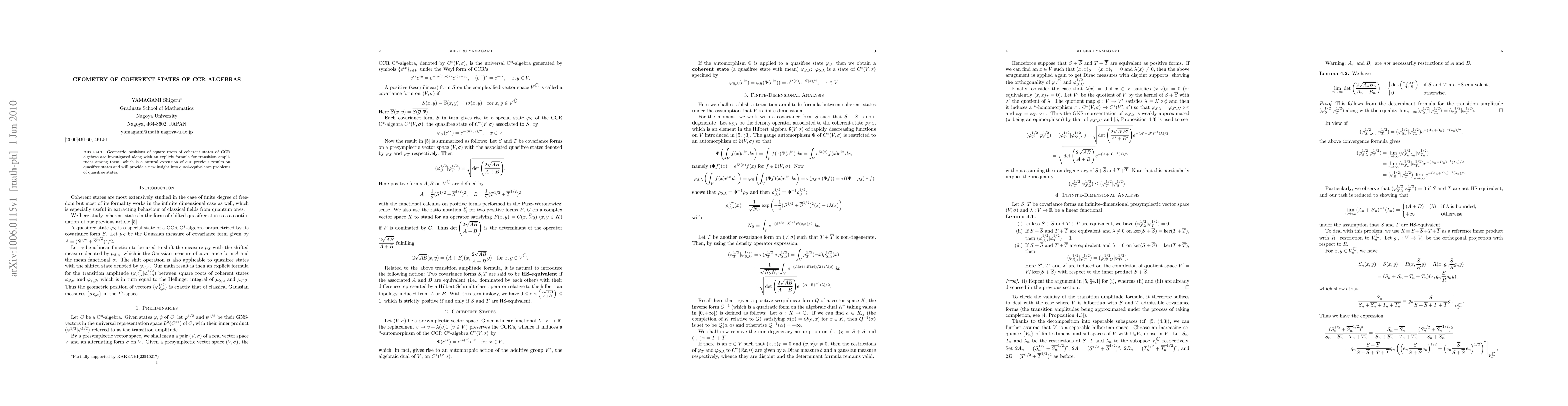 Geometric positions of square roots of coherent states of CCR algebras are investigated along with an explicit formula for transition amplitudes among them, which is a natural extension of our previous results on quasifree states and will provide a new insight into quasi-equivalence problems of quasifree states.