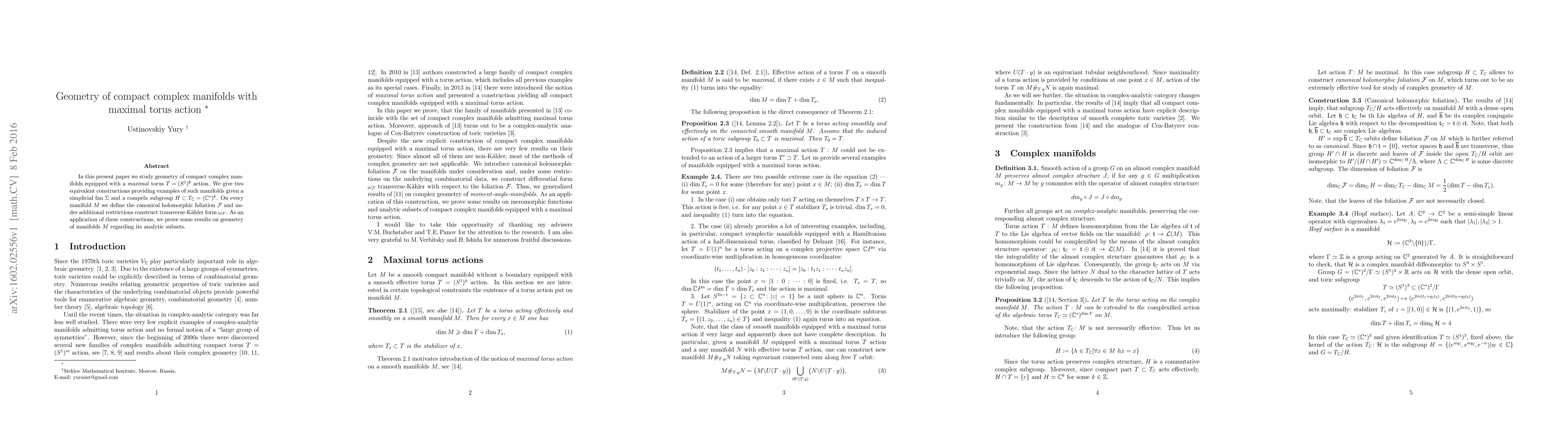 In this present paper we study geometry of compact complex manifolds equipped with a \emph{maximal} torus $T=(S^1)^k$ action. We give two equivalent constructions providing examples of such manifolds given a simplicial fan $\Sigma$ and a compelx subgroup $H\subset T_\mathbb C=(\mathbb C^*)^k$. On every manifold $M$ we define the canonical holomorphic foliation $\mathcal F$ and under additional restrictions construct transverse-K\"{a}hler form $\omega_\mathcal F$. As an application of these constructions, we prove some results on geometry of manifolds~$M$ regarding its analytic subsets.