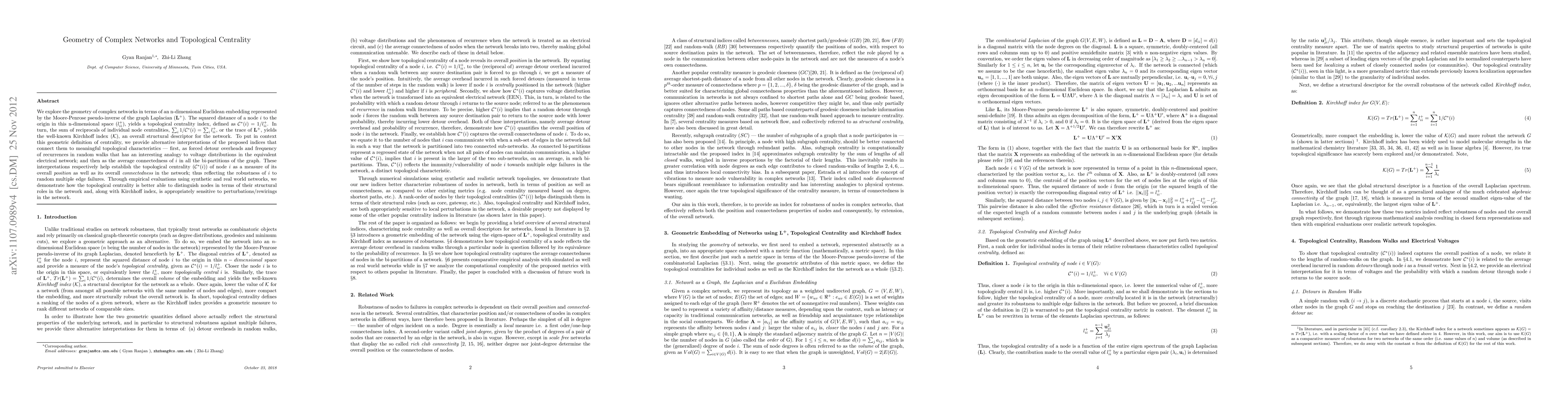 We explore the geometry of complex networks in terms of an n-dimensional Euclidean embedding represented by the Moore-Penrose pseudo-inverse of the graph Laplacian $(\bb L^+)$. The squared distance of a node $i$ to the origin in this n-dimensional space $(l^+_{ii})$, yields a topological centrality index $(\mathcal{C}^{*}(i) = 1/l^+_{ii})$ for node $i$. In turn, the sum of reciprocals of individual node structural centralities, $\sum_{i}1/\mathcal{C}^*(i) = \sum_{i} l^+_{ii}$, i.e. the trace of $\bb L^+$, yields the well-known Kirchhoff index $(\mathcal{K})$, an overall structural descriptor for the network. In addition to this geometric interpretation, we provide alternative interpretations of the proposed indices to reveal their true topological characteristics: first, in terms of forced detour overheads and frequency of recurrences in random walks that has an interesting analogy to voltage distributions in the equivalent electrical network; and then as the average connectedness of $i$ in all the bi-partitions of the graph. These interpretations respectively help establish the topological centrality $(\mathcal{C}^{*}(i))$ of node $i$ as a measure of its overall position as well as its overall connectedness in the network; thus reflecting the robustness of node $i$ to random multiple edge failures. Through empirical evaluations using synthetic and real world networks, we demonstrate how the topological centrality is better able to distinguish nodes in terms of their structural roles in the network and, along with Kirchhoff index, is appropriately sensitive to perturbations/rewirings in the network.