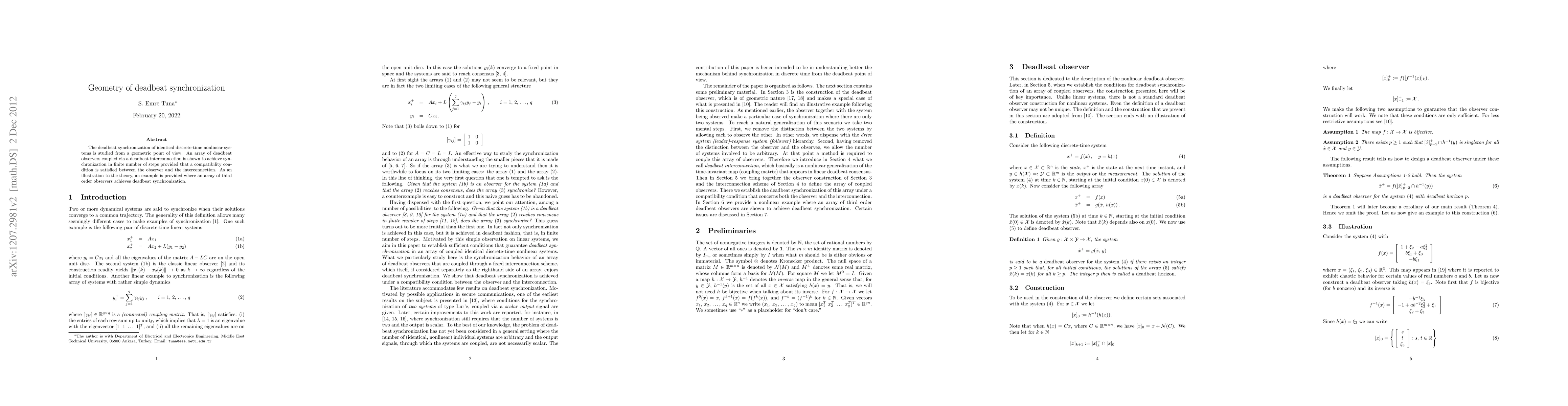The deadbeat synchronization of identical discrete-time nonlinear systems is studied from a geometric point of view. An array of deadbeat observers coupled via a deadbeat interconnection is shown to achieve synchronization in finite number of steps provided that a compatibility condition is satisfied between the observer and the interconnection. As an illustration to the theory, an example is provided where an array of third order observers achieves deadbeat synchronization.