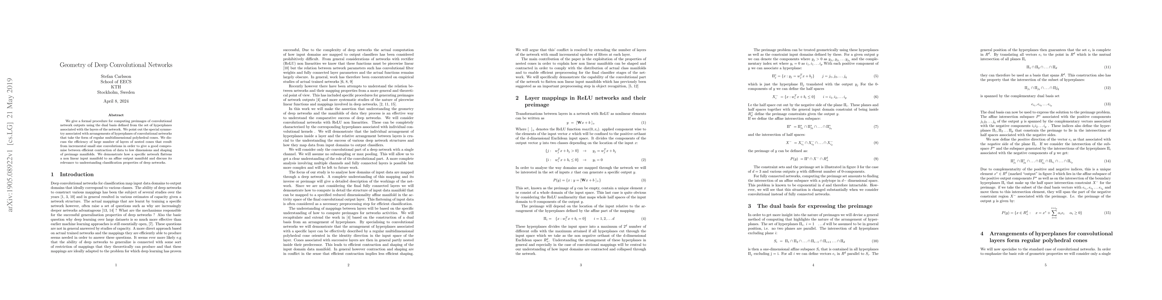 This paper presents a method for computing the preimages of convolutional network outputs using dual basis and hyperplane arrangements, highlighting the symmetry of regular multidimensional polyhedral cones in deep networks. It discusses the efficiency of nested cones from small convolutions and demonstrates how networks flatten nonlinear input manifolds to affine outputs, aiding in understanding classification properties.