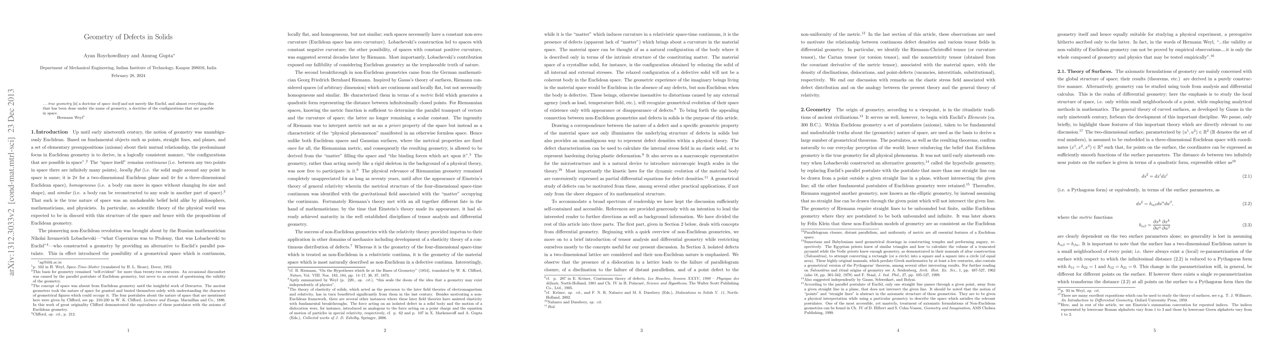 The novelty of this research lies in its geometric approach to understanding defects in solids, providing a new perspective that connects differential geometry with material science, thereby offering a theoretical framework for interpreting and predicting material behavior based on geometric properties.