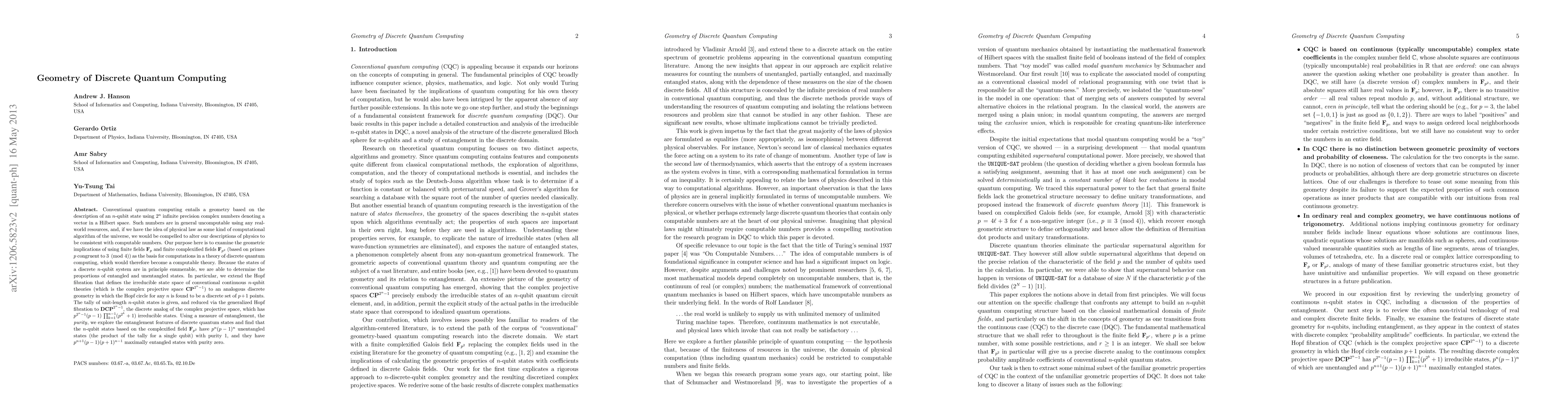 Conventional quantum computing entails a geometry based on the description of an n-qubit state using 2^{n} infinite precision complex numbers denoting a vector in a Hilbert space. Such numbers are in general uncomputable using any real-world resources, and, if we have the idea of physical law as some kind of computational algorithm of the universe, we would be compelled to alter our descriptions of physics to be consistent with computable numbers. Our purpose here is to examine the geometric implications of using finite fields Fp and finite complexified fields Fp^2 (based on primes p congruent to 3 mod{4}) as the basis for computations in a theory of discrete quantum computing, which would therefore become a computable theory. Because the states of a discrete n-qubit system are in principle enumerable, we are able to determine the proportions of entangled and unentangled states. In particular, we extend the Hopf fibration that defines the irreducible state space of conventional continuous n-qubit theories (which is the complex projective space CP{2^{n}-1}) to an analogous discrete geometry in which the Hopf circle for any n is found to be a discrete set of p+1 points. The tally of unit-length n-qubit states is given, and reduced via the generalized Hopf fibration to DCP{2^{n}-1}, the discrete analog of the complex projective space, which has p^{2^{n}-1} (p-1)\prod_{k=1}^{n-1} (p^{2^{k}}+1) irreducible states. Using a measure of entanglement, the purity, we explore the entanglement features of discrete quantum states and find that the n-qubit states based on the complexified field Fp^2 have p^{n} (p-1)^{n} unentangled states (the product of the tally for a single qubit) with purity 1, and they have p^{n+1}(p-1)(p+1)^{n-1} maximally entangled states with purity zero.