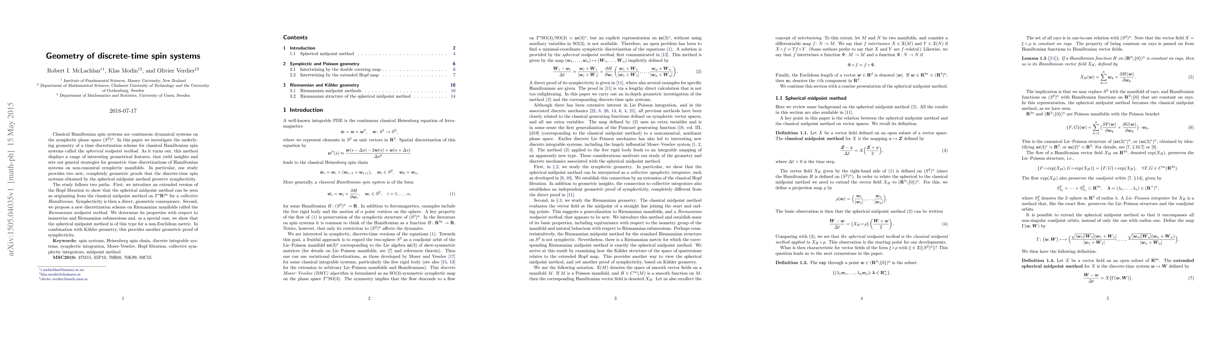 Classical Hamiltonian spin systems are continuous dynamical systems on the symplectic phase space $(S^2)^n$. In this paper we investigate the underlying geometry of a time discretization scheme for classical Hamiltonian spin systems called the spherical midpoint method. As it turns out, this method displays a range of interesting geometrical features, that yield insights and sets out general strategies for geometric time discretizations of Hamiltonian systems on non-canonical symplectic manifolds. In particular, our study provides two new, completely geometric proofs that the discrete-time spin systems obtained by the spherical midpoint method preserve symplecticity. The study follows two paths. First, we introduce an extended version of the Hopf fibration to show that the spherical midpoint method can be seen as originating from the classical midpoint method on $T^*\mathbf{R}^{2n}$ for a collective Hamiltonian. Symplecticity is then a direct, geometric consequence. Second, we propose a new discretization scheme on Riemannian manifolds called the Riemannian midpoint method. We determine its properties with respect to isometries and Riemannian submersions and, as a special case, we show that the spherical midpoint method is of this type for a non-Euclidean metric. In combination with K\"ahler geometry, this provides another geometric proof of symplecticity.