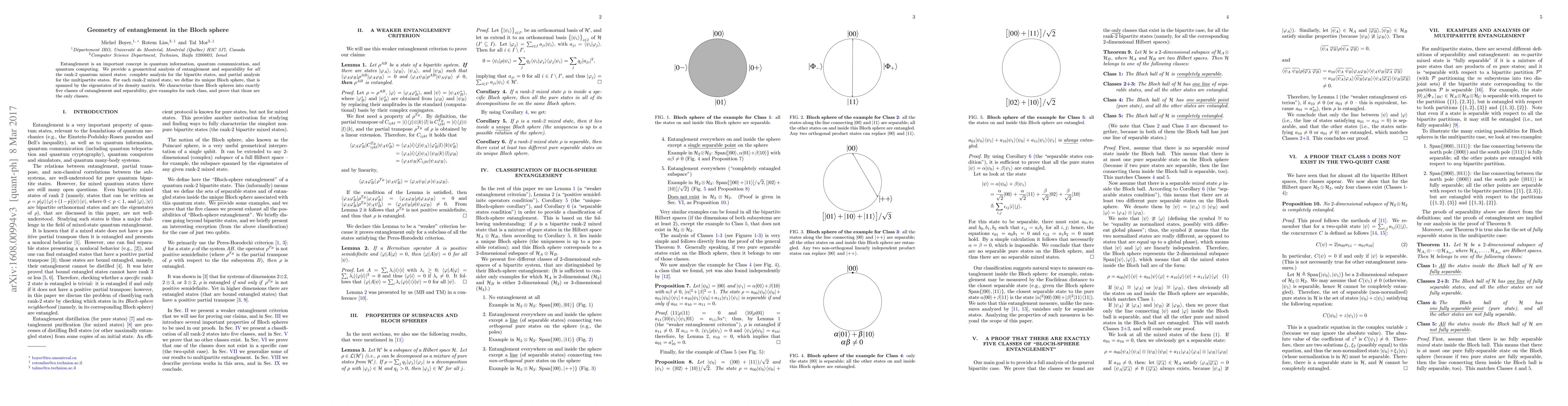 Researchers analyzed entanglement in quantum states using a geometric approach, categorizing it into 5 classes of separability, and found that these categories uniquely characterize all rank-2 mixed states.