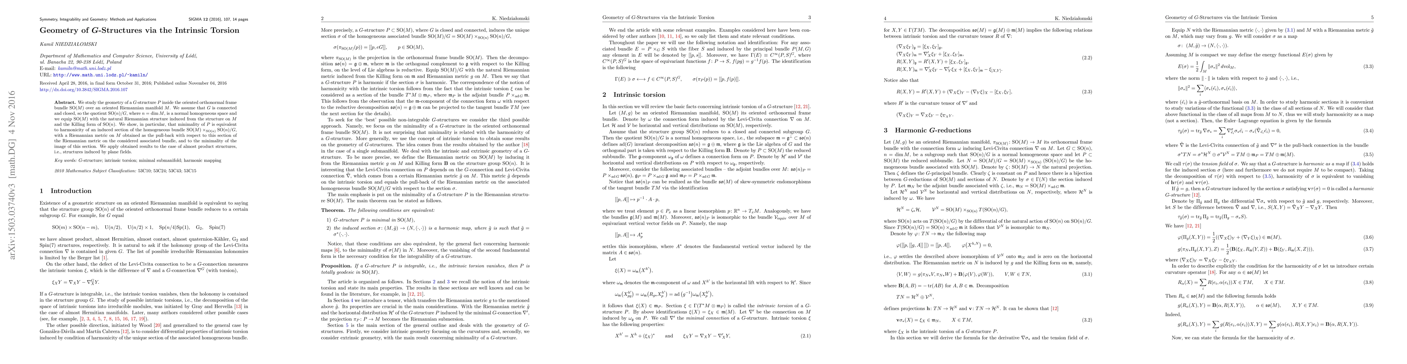 We study the geometry of a $G$-structure $P$ inside the oriented orthonormal frame bundle ${\rm SO}(M)$ over an oriented Riemannian manifold $M$. We assume that $G$ is connected and closed, so the quotient ${\rm SO}(n)/G$, where $n=\dim M$, is a normal homogeneous space and we equip ${\rm SO}(M)$ with the natural Riemannian structure induced from the structure on $M$ and the Killing form of ${\rm SO}(n)$. We show, in particular, that minimality of $P$ is equivalent to harmonicity of an induced section of the homogeneous bundle ${\rm SO}(M)\times_{{\rm SO}(n)}{\rm SO}(n)/G$, with a Riemannian metric on $M$ obtained as the pull-back with respect to this section of the Riemannian metric on the considered associated bundle, and to the minimality of the image of this section. We apply obtained results to the case of almost product structures, i.e., structures induced by plane fields.