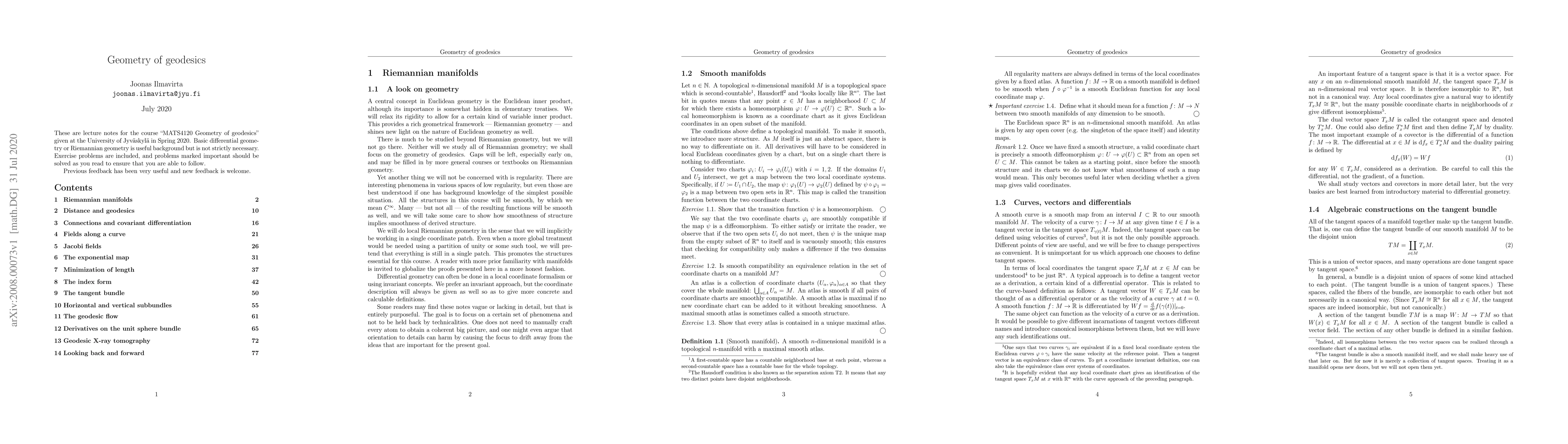 These are lecture notes for the course "MATS4120 Geometry of geodesics" given at the University of Jyv\"askyl\"a in Spring 2020. Basic differential geometry or Riemannian geometry is useful background but is not strictly necessary. Exercise problems are included, and problems marked important should be solved as you read to ensure that you are able to follow.