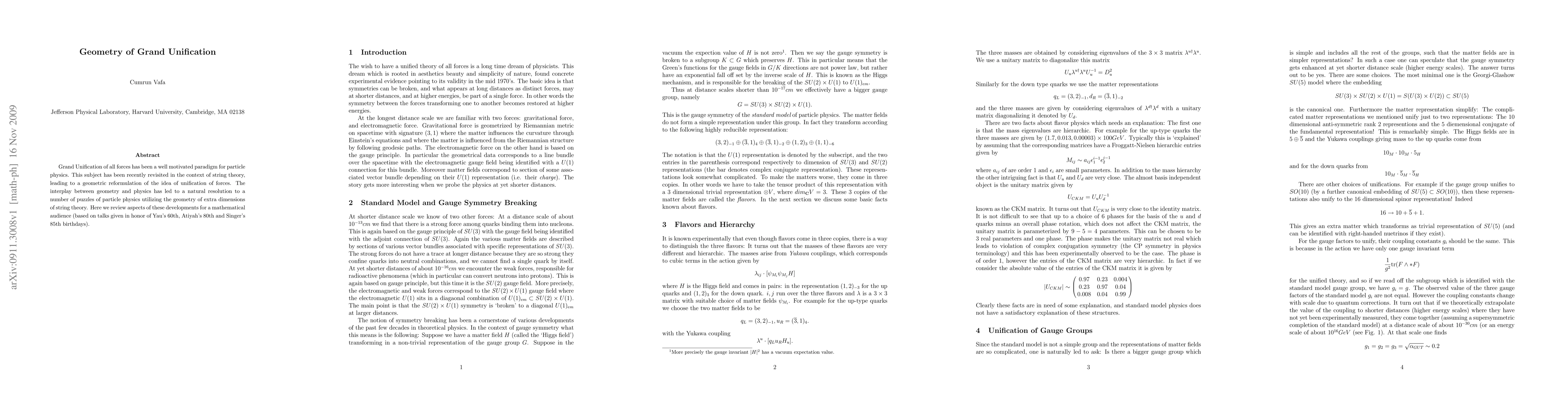 This paper reviews the geometric reformulation of grand unification in particle physics within the framework of string theory, highlighting how string theory's extra dimensions resolve several particle physics puzzles. The discussion is aimed at a mathematical audience and commemorates significant birthdays in the field.