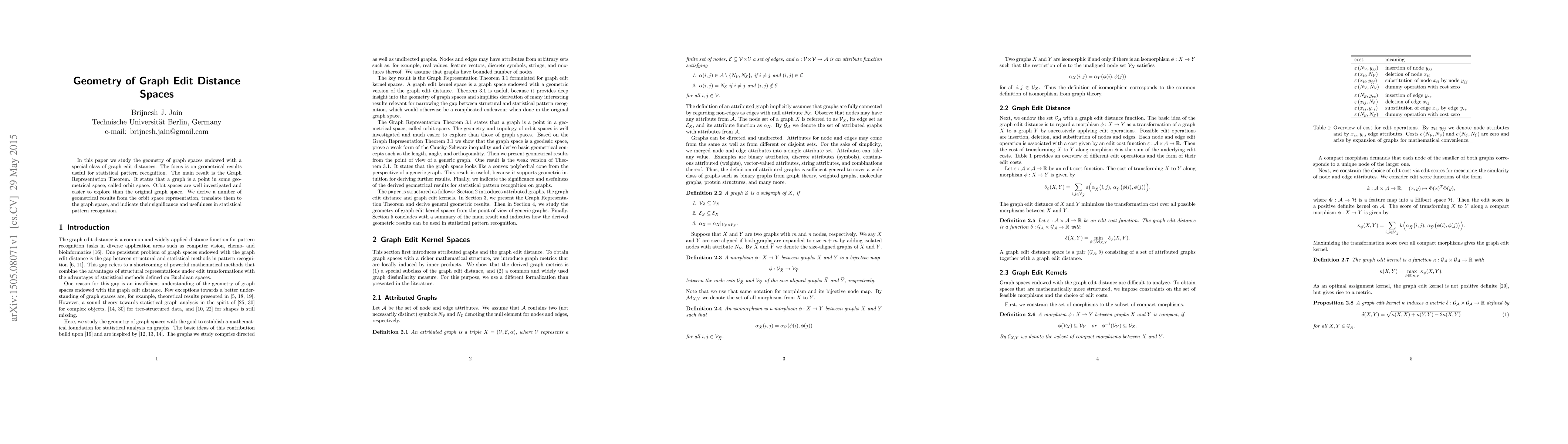 This paper studies the geometry of graph spaces with special graph edit distances to aid statistical pattern recognition. It introduces the Graph Representation Theorem, transforming graphs into orbit spaces for easier exploration.