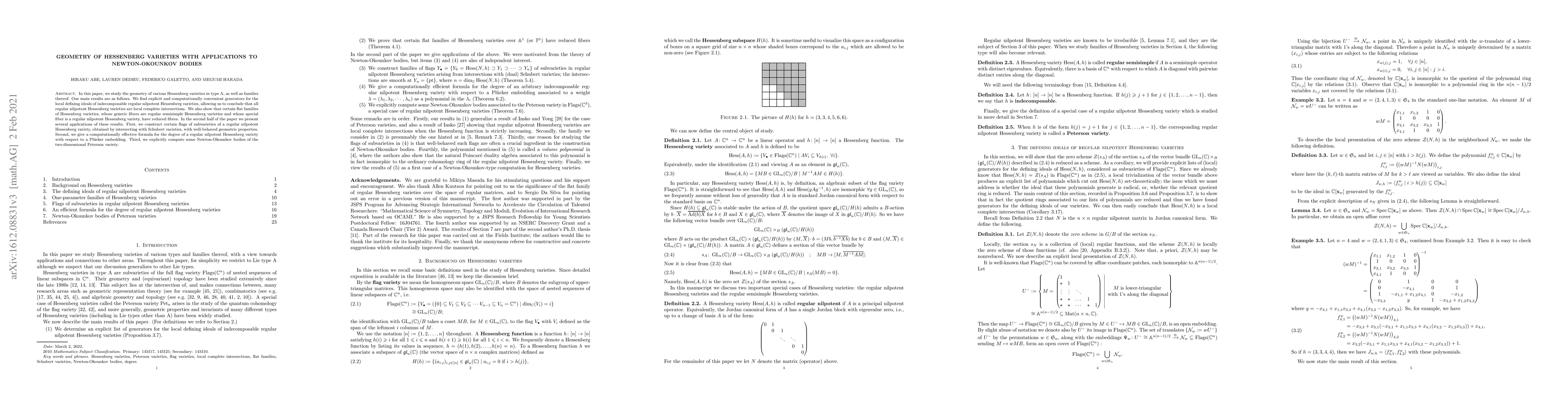 This paper explores the geometry of Hessenberg varieties in type A and establishes generators for their local defining ideals, proving they are local complete intersections. It also provides a formula for their degrees and constructs flags for computing Newton-Okounkov bodies, ultimately computing the Newton-Okounkov bodies of the Peterson variety.