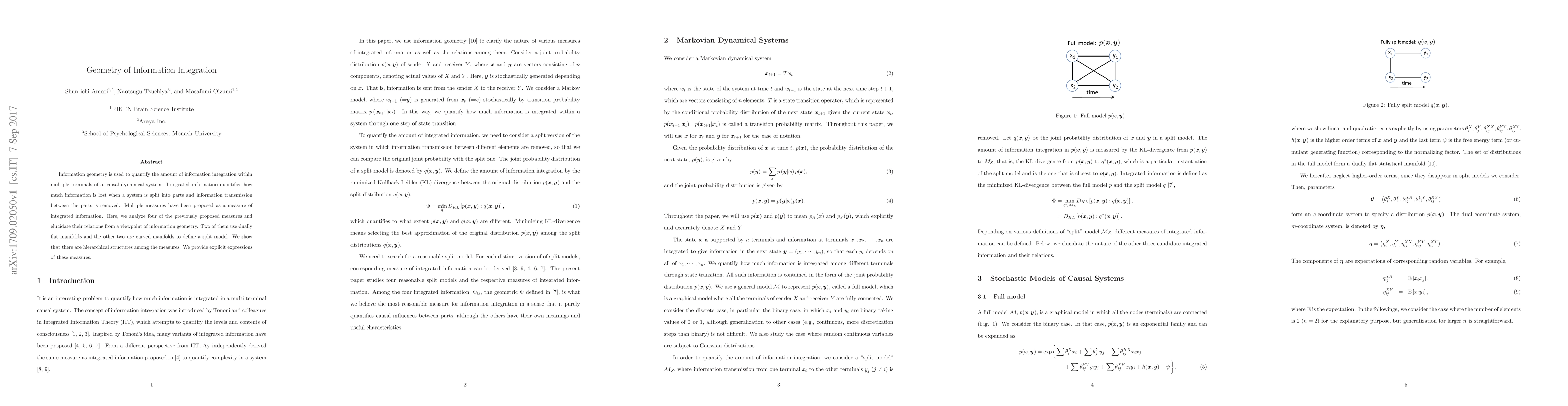 Information geometry is used to quantify the amount of information integration within multiple terminals of a causal dynamical system. Integrated information quantifies how much information is lost when a system is split into parts and information transmission between the parts is removed. Multiple measures have been proposed as a measure of integrated information. Here, we analyze four of the previously proposed measures and elucidate their relations from a viewpoint of information geometry. Two of them use dually flat manifolds and the other two use curved manifolds to define a split model. We show that there are hierarchical structures among the measures. We provide explicit expressions of these measures.