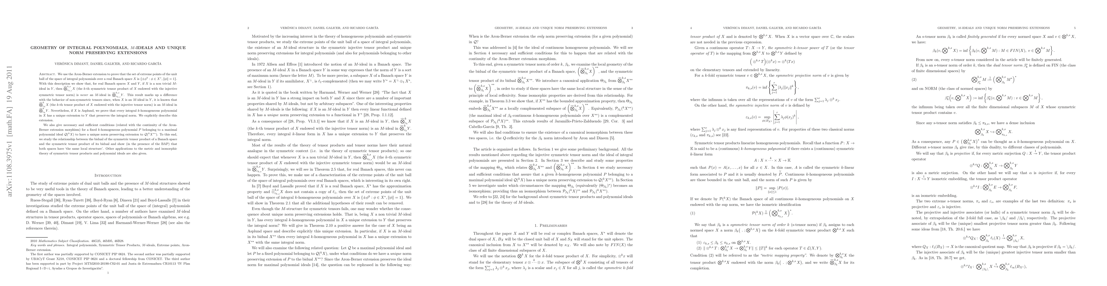 We use the Aron-Berner extension to prove that the set of extreme points of the unit ball of the space of integral polynomials over a real Banach space $X$ is $\{\pm \phi^k: \phi \in X^*, \| \phi\|=1\}$. With this description we show that, for real Banach spaces $X$ and $Y$, if $X$ is a non trivial $M$-ideal in $Y$, then $\hat\bigotimes^{k,s}_{\epsilon_{k,s}} X$ (the $k$-th symmetric tensor product of $X$ endowed with the injective symmetric tensor norm) is \emph{never} an $M$-ideal in $\hat\bigotimes^{k,s}_{\epsilon_{k,s}} Y$. This result marks up a difference with the behavior of non-symmetric tensors since, when $X$ is an $M$-ideal in $Y$, it is known that $\hat\bigotimes^k_{\epsilon_k} X$ (the $k$-th tensor product of $X$ endowed with the injective tensor norm) is an $M$-ideal in $\hat\bigotimes^k_{\epsilon_k} Y$. Nevertheless, if $X$ is Asplund, we prove that every integral $k$-homogeneous polynomial in $X$ has a unique extension to $Y$ that preserves the integral norm. We explicitly describe this extension. We also give necessary and sufficient conditions (related with the continuity of the Aron-Berner extension morphism) for a fixed $k$-homogeneous polynomial $P$ belonging to a maximal polynomial ideal $\Q(^kX)$ to have a unique norm preserving extension to $\Q(^kX^{**})$. To this end, we study the relationship between the bidual of the symmetric tensor product of a Banach space and the symmetric tensor product of its bidual and show (in the presence of the BAP) that both spaces have `the same local structure'. Other applications to the metric and isomorphic theory of symmetric tensor products and polynomial ideals are also given.