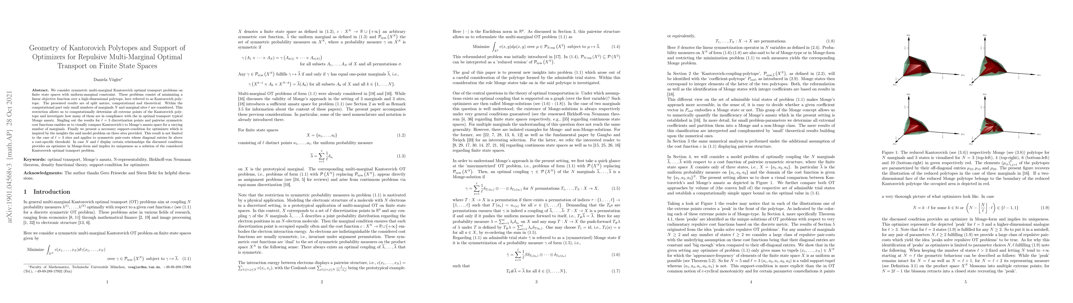 We consider symmetric multi-marginal Kantorovich optimal transport problems on finite state spaces with uniform-marginal constraint. These problems consist of minimizing a linear objective function over a high-dimensional polytope, here referred to as Kantorovich polytope. The presented results are of split nature, computational and theoretical. Within the computational part only small numbers of marginals $N$ and marginal sites $\ell$ are considered. This restriction allows us to computationally determine all extreme points of the Kantorovich polytope and investigate how many of them are in compliance with the in optimal transport typical Monge ansatz. Singling out the results for $\ell=3$ discretization points and pairwise symmetric cost functions enables us to visually compare Kantorovich's to Monge's ansatz space for a varying number of marginals. Finally we present a necessary support-condition for optimizers which is inspired by the insights the said model problem on three sites provided. This result is not limited to the case of $\ell=3$ sites and applies to symmetric pair-costs whose diagonal entries lie above a cost-specific threshold. In case $N$ and $\ell$ display certain relationships the discussed condition provides an optimizer in Monge-form and implies its uniqueness as a solution of the considered Kantorovich optimal transport problem.