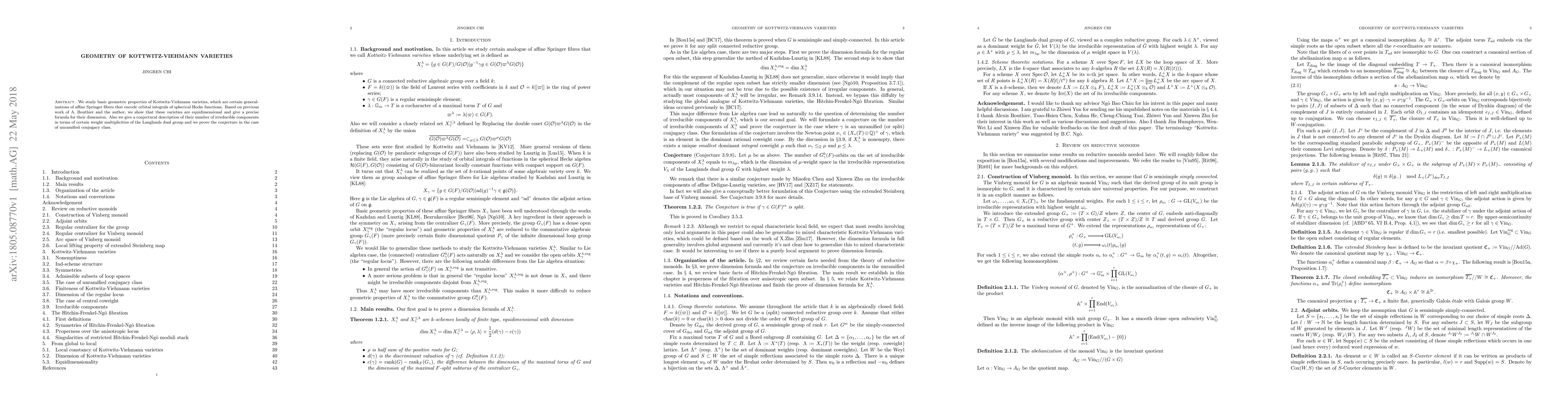 We study basic geometric properties of Kottwitz-Viehmann varieties, which are certain generalizations of affine Springer fibers that encode orbital integrals of spherical Hecke functions. Based on previous work of A. Bouthier and the author, we show that these varieties are equidimensional and give a precise formula for their dimension. Also we give a conjectural description of their number of irreducible components in terms of certain weight multiplicities of the Langlands dual group and we prove the conjecture in the case of unramified conjugacy class.