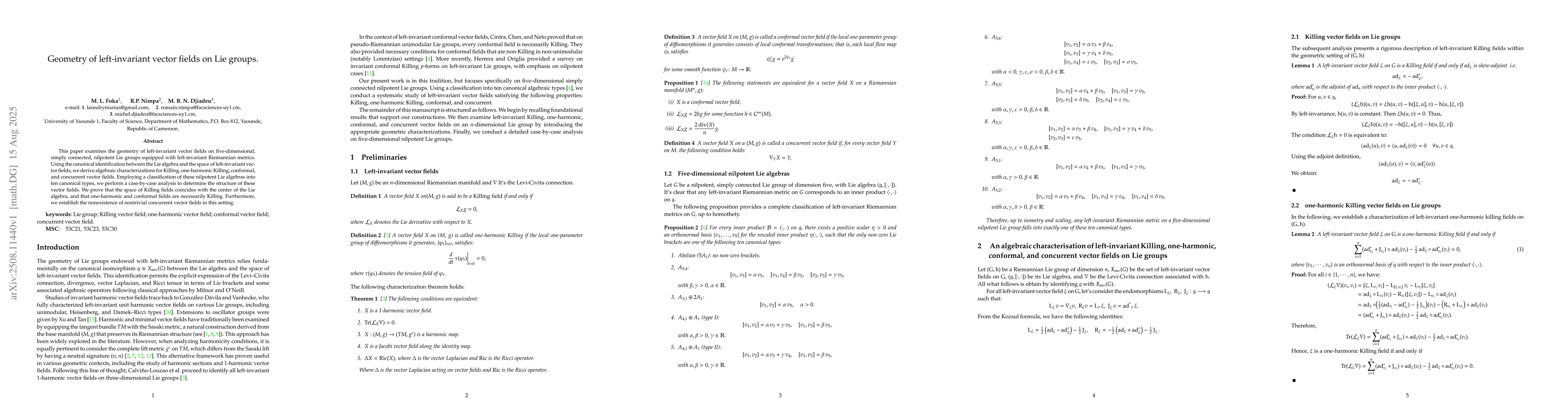 This paper examines the geometry of left-invariant vector fields on five-dimensional, simply connected, nilpotent Lie groups equipped with left-invariant Riemannian metrics. Using the canonical identification between the Lie algebra and the space of left-invariant vector fields, we derive algebraic characterizations for Killing, one-harmonic Killing, conformal, and concurrent vector fields. Employing a classification of these nilpotent Lie algebras into ten canonical types, we perform a case-by-case analysis to determine the structure of these vector fields. We prove that the space of Killing fields coincides with the center of the Lie algebra, and that one-harmonic and conformal fields are necessarily Killing. Furthermore, we establish the nonexistence of nontrivial concurrent vector fields in this setting.